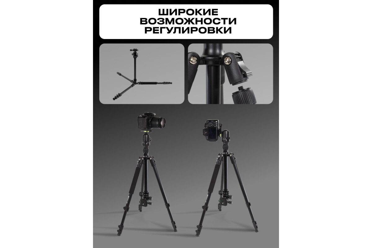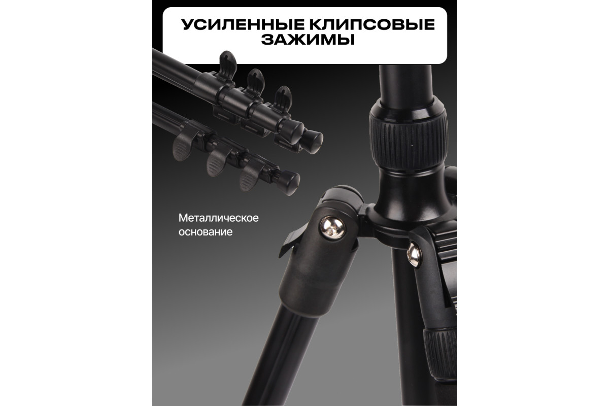 Клипсовые зажимы четырех секций ног штатива помогут надежно и быстро зафиксировать необходимую высоту для съемки вкупе с выдвижной центральной колонной позволяя добиться максимального комфорта при её проведении. Изменяемые углы наклона ног штатива помогут надежно установить штатив практически на любой поверхности.