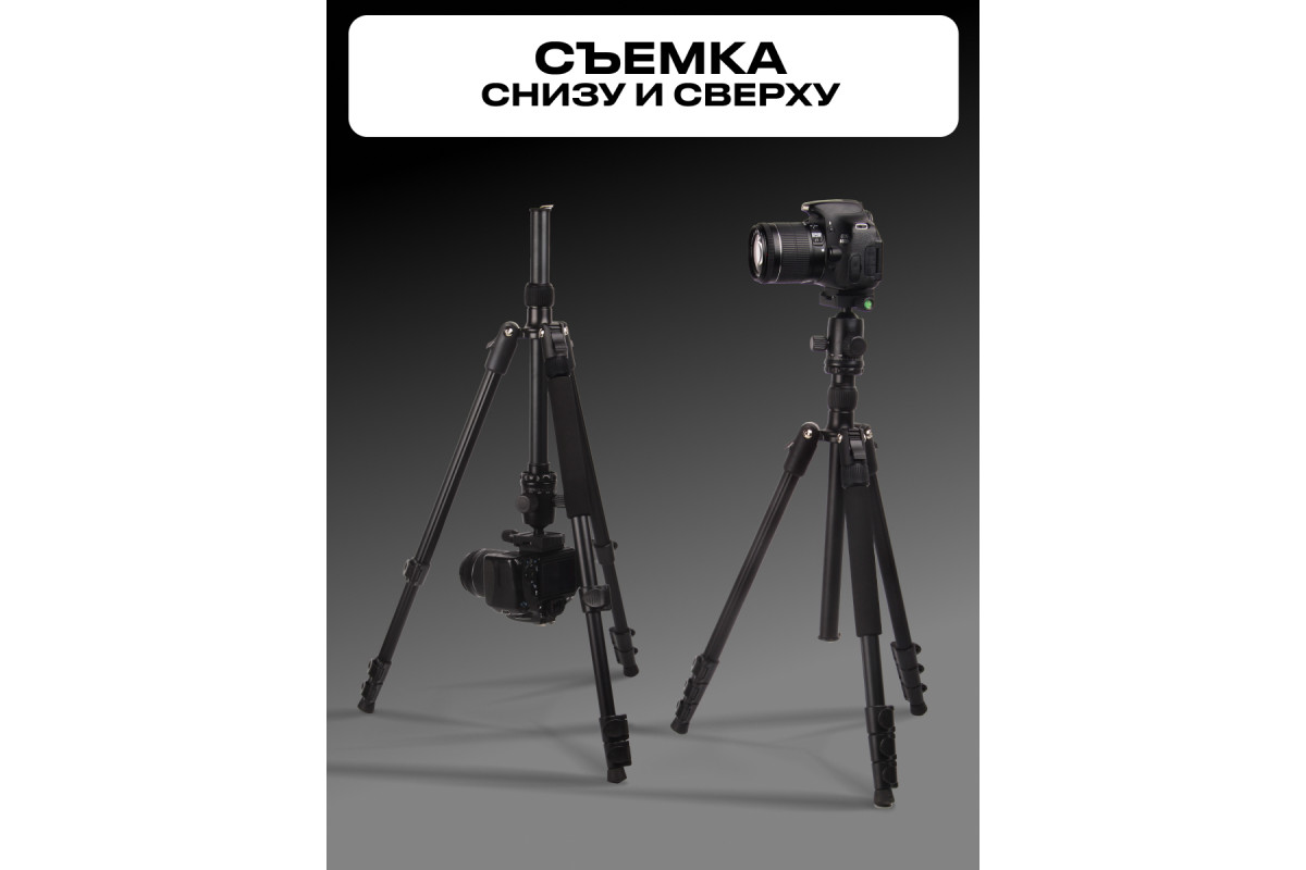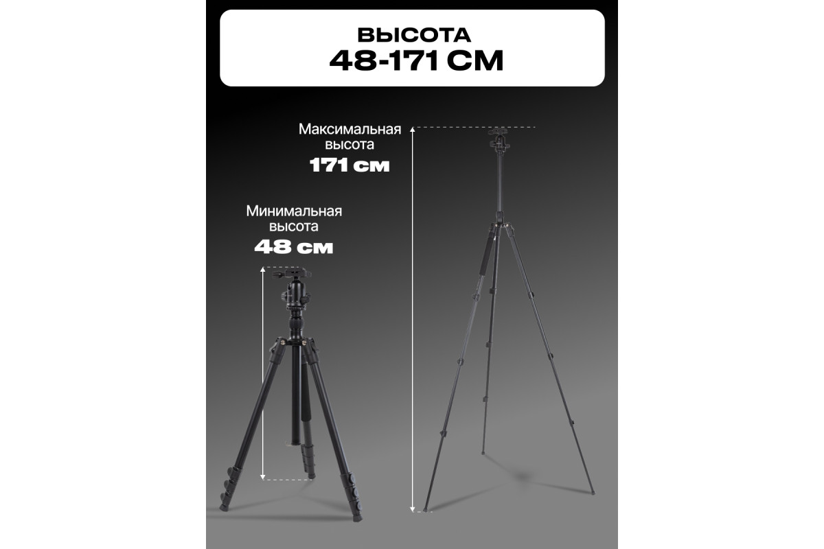 Монопод можно использовать просто, отсоединив одну из ног штатива и установив на неё штативную голову. Максимальная рабочая высота монопода 165 см. Минимальная рабочая высота 48,5 см.