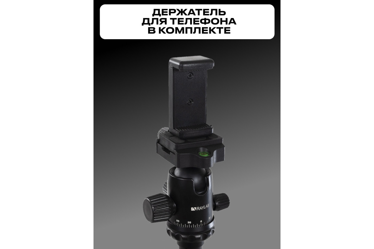 Штатив Raylab Pro 65” со сменной шаровой головой, быстросъемной площадкой, встроенным моноподом, реверсивной установкой центральной колонны, крюком для груза противовеса и клипсовыми зажимами ног штатива.
