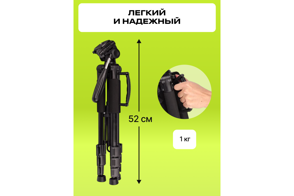 Штатив используется для съемки с длинной выдержкой, панорамы, пейзажей, макросъемки, таймлапс. Благодаря наличию трех ног с клипсовыми зажимами, конструкцию можно быстро и надежно зафиксировать, получив необходимую высоту для съемки. Изменяемый угол наклона позволяет установить конструкцию на любой горизонтальной поверхности. Модель Трэвел 55 совместима со всеми современными камерами.
