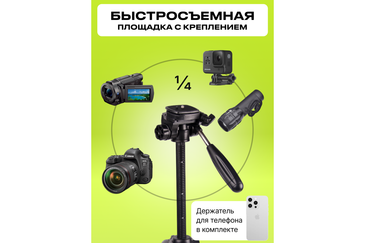 Дополнен аксессуар специальной быстросъемной площадкой. Она позволяет быстро заменить фотоаппарат. Во время замены устройства опорная пластина останется на месте, что предотвратит случайное падение камеры.