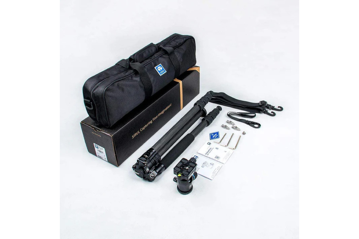 Набор из штатива Sirui AM-1204K и шаровой головы K-10X. Предназначен для использования в полевых условиях, изготовлен из современного карбонового волокна, сочетающего малый вес и высокую прочность. В сложенном состоянии штатив достаточно компактный, его легко можно носить с собой. Для использования в полевых условиях предназначены съемные насадки на ножки с шипами. Для гладких поверхностей используют прорезиненные антискользящие накладки. Центральную колонну штатива можно установить «вверх ногами», либо использовать рак монопод, предварительно соединив его с одной из ножек. Шаровая голова выдерживает вес до 20 кг, имеет встроенный пузырьковый уровень.