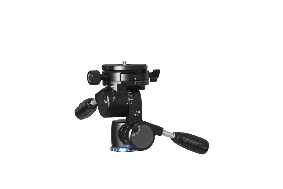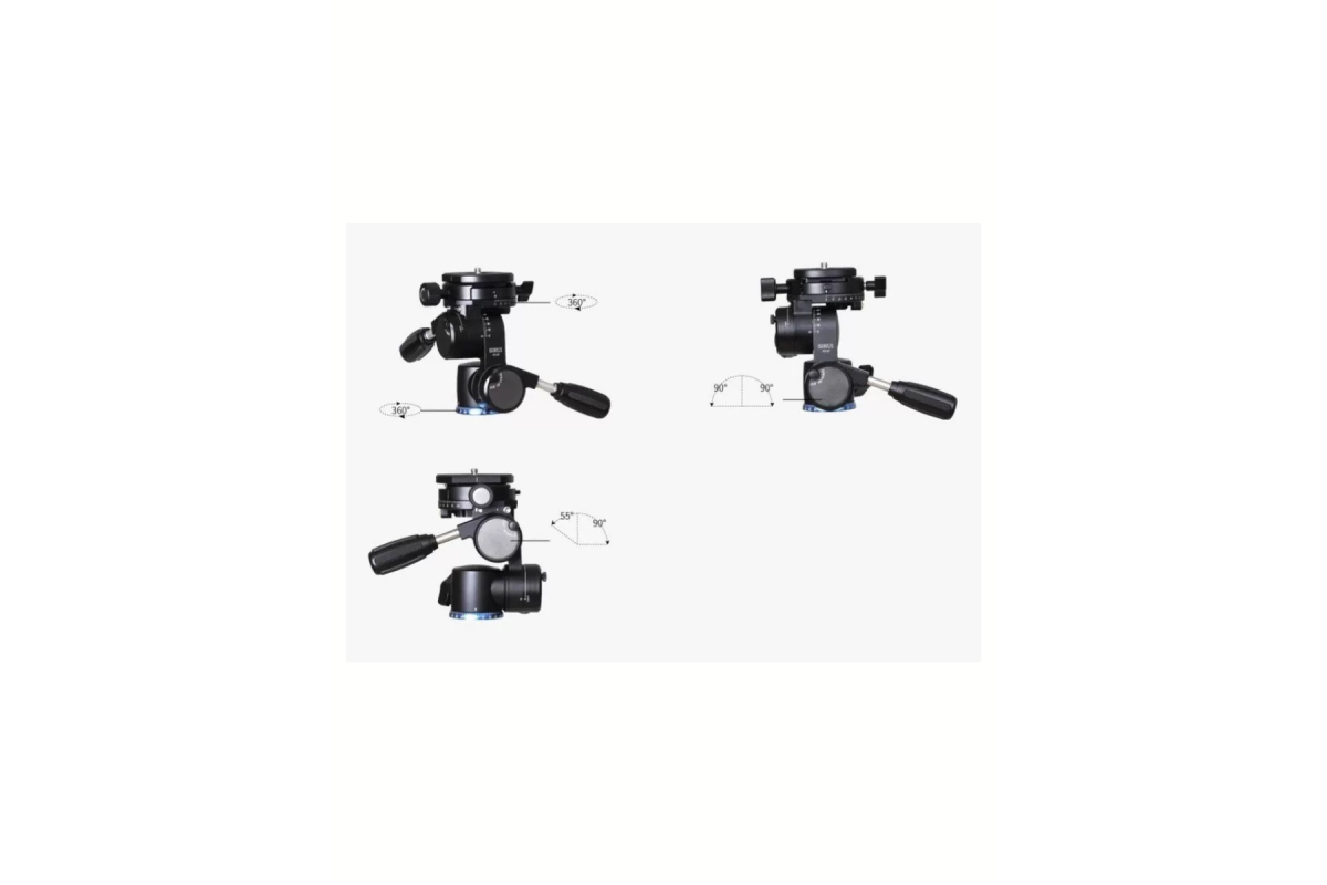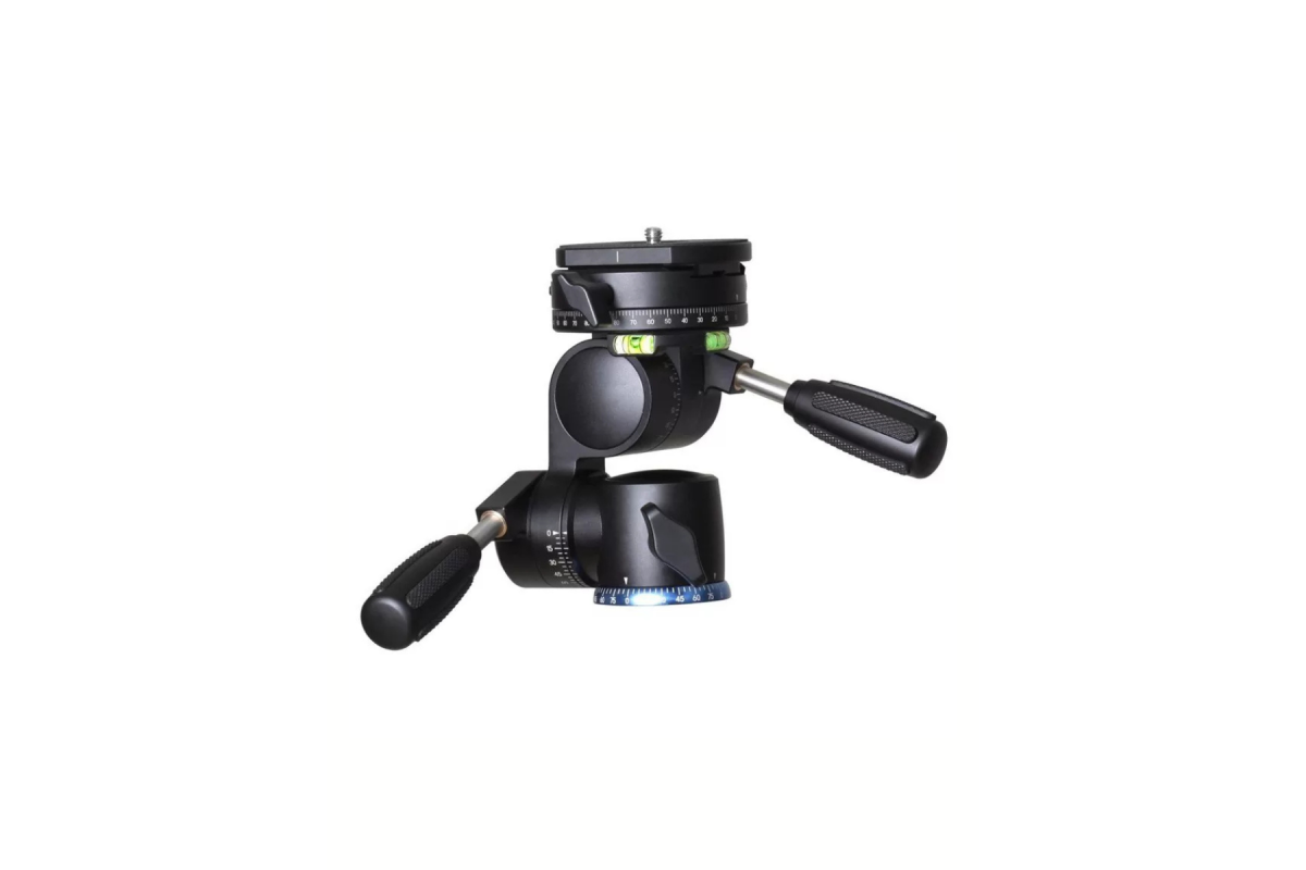 Штативная голова необычной конструкции позволяет установить камеру под любым углом, а также снимать с необычных ракурсов и проходов благодаря сразу четырём подвижным осям. Основание и верхняя площадка разворачиваются на полные 360° градусов, нижнее плечо имеет диапазон 180° наклона, а верхнее 145°, с возможностью фиксирования позиции