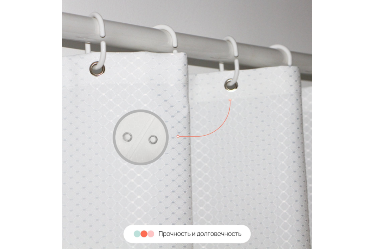 Штора имеет 100% водоотталкивающие свойства, ее поверхность не выделяет неприятного запаха, легко чистится, не впитывает загрязнения. Штора изготовлена из полиэстера, который придает изделию прочность и неприхотливость, долго сохраняет форму и внешний вид изделия, быстро сохнет.