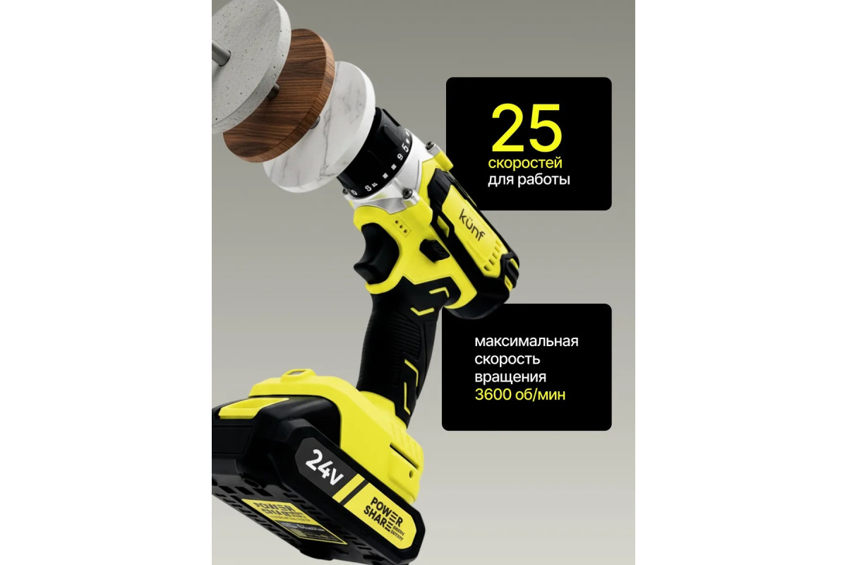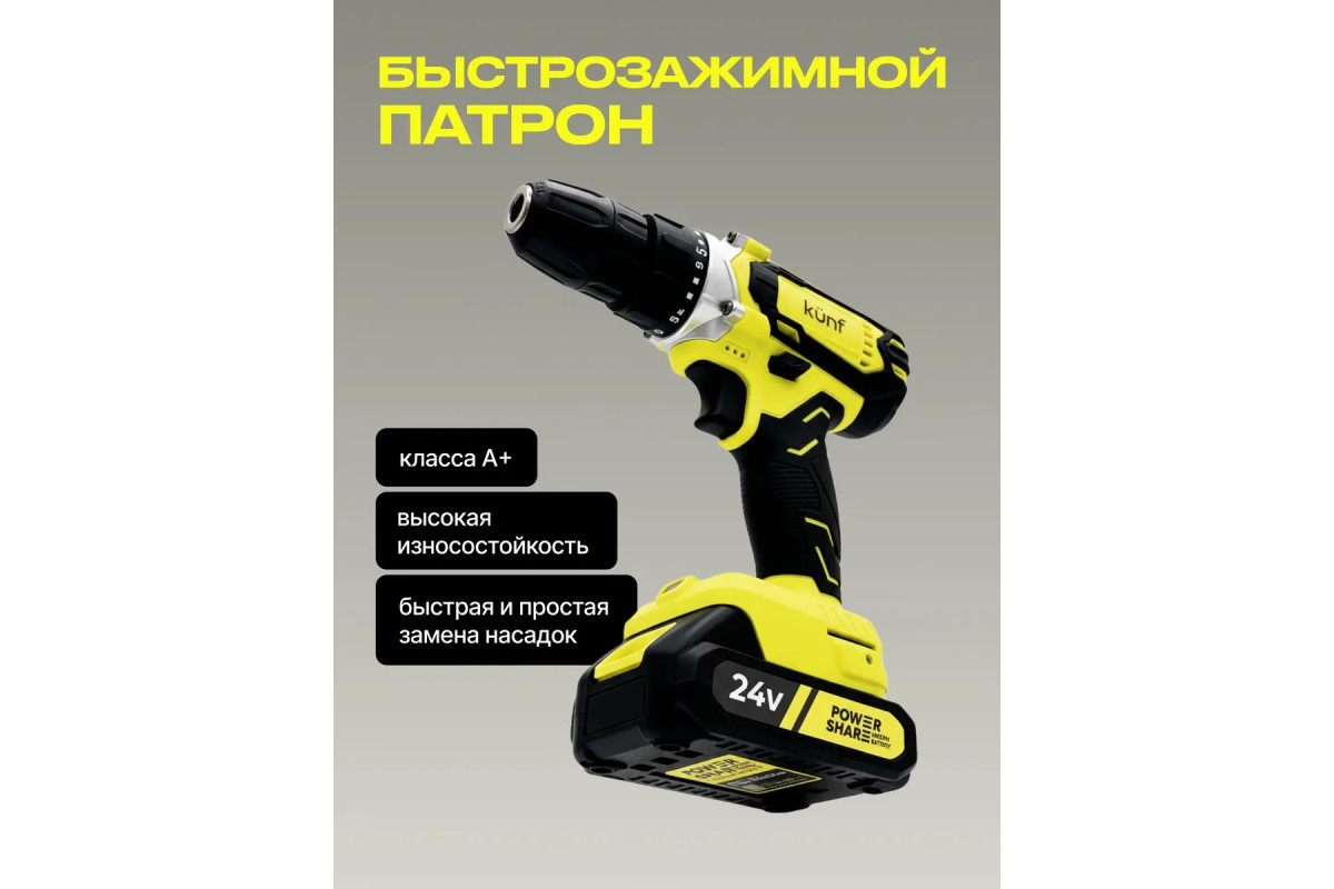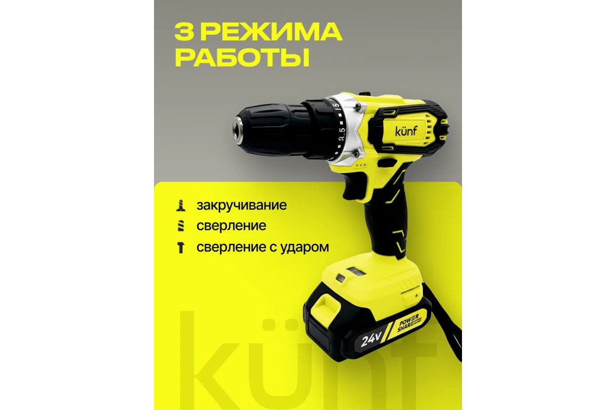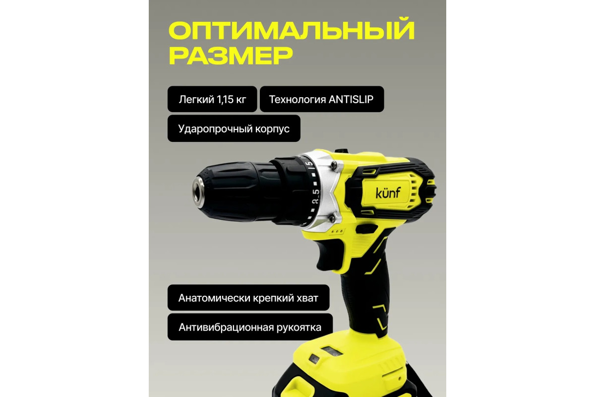 Шуруповерт аккумуляторный KUNF – это надёжный инструмент для дома и профессиональной стройки с щеточным двигателем и двумя литий-ионными аккумуляторами общим объемом 5 А·ч, обеспечивающими длительную автономную работу. Двухскоростной режим и ударная функция позволяют работать как с закручиванием шурупов, так и со сверлением дерева (до 21 мм) и стали (до 11 мм). Быстрозажимной патрон 10 мм облегчает замену оснастки. Корпус из ударопрочного ABS с резиновыми вставками защищает инструмент от повреждений. Подсветка рабочей зоны улучшает видимость, а индикатор заряда контролирует уровень аккумулятора. В комплект входят два аккумулятора, блок питания, набор оснастки из 24 предметов, поясной держатель, 10 бит, перчатки с логотипом KUNF, очки, инструкция и вкладыш.