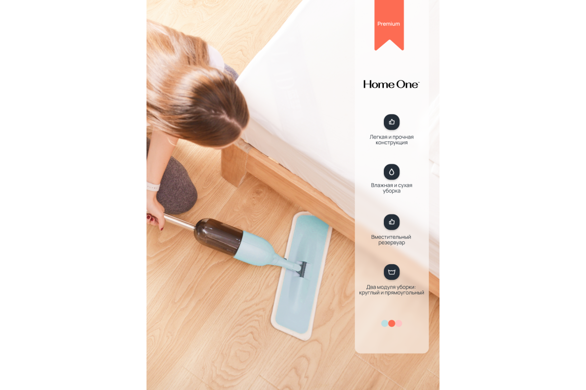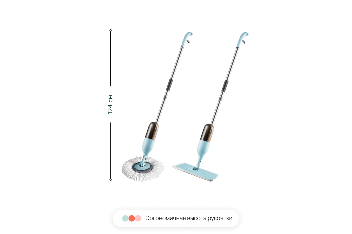 Легкая и прочная швабра с распылителем Home One создана для удобной, простой и эффективной уборки в вашем доме, подходит для сухой и влажной уборки. Швабра имеет резервуар для воды увеличенной емкости - 420мл. В комплект входят 2 сменных модуля уборки: прямоугольной формы шириной 40см и круглой формы диаметром 34см. Комбинируя модули, вам будет просто вымыть пол в любом даже плохо доступном месте вашего дома. Высота ручки швабры продумана с точки зрения эргономики использования и составляет 124см - это уменьшает нагрузку на спину и суставы во время работы. Насадки, используемые в модулях, изготовлены из микрофибры, отлично впитывающий материал, не подвержен износу и деформации, долговечный и практичный.