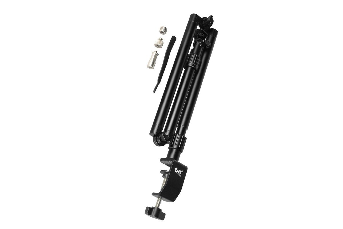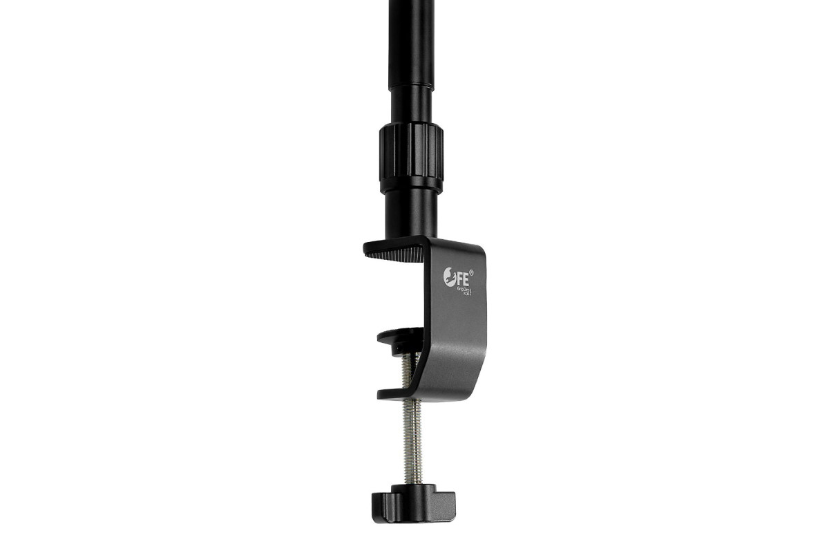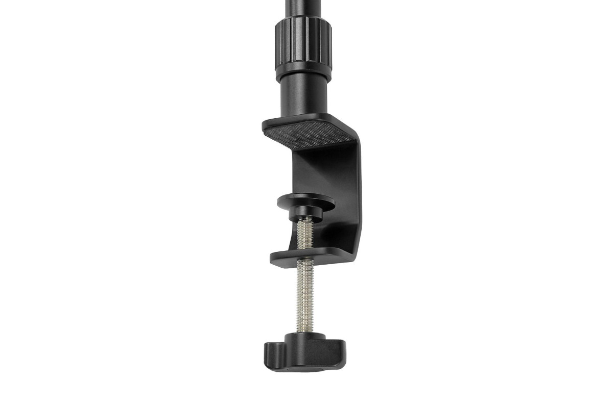 Трехсекционный держатель оснащен мини-головкой с винтом 1/4" для крепления студийного оборудования. Металлическая мини-головка помогает закрепить оборудование под углом до 90° и с поворотом на 360°. Струбцина зажимается на плоской поверхности толщиной до 60 мм. Максимальная высота установки оборудования – 95 см.