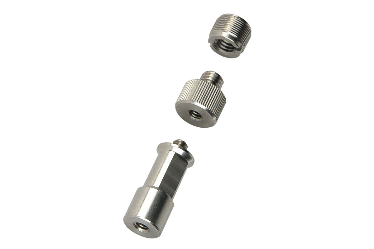 Переходники 1/4" – 3/8" и 1/4" – 5/8" позволят закрепить оборудование с соответствующими резьбовыми отверстиями 3/8" и 5/8" соответственно, такие как микрофонные держатели, клетки, риги и т.д. Штифт 5/8” с резьбой 1/4” превращает держатель в осветительную стойку со стандартным креплением Baby Pin для установки кольцевой лампы или небольшого осветителя.