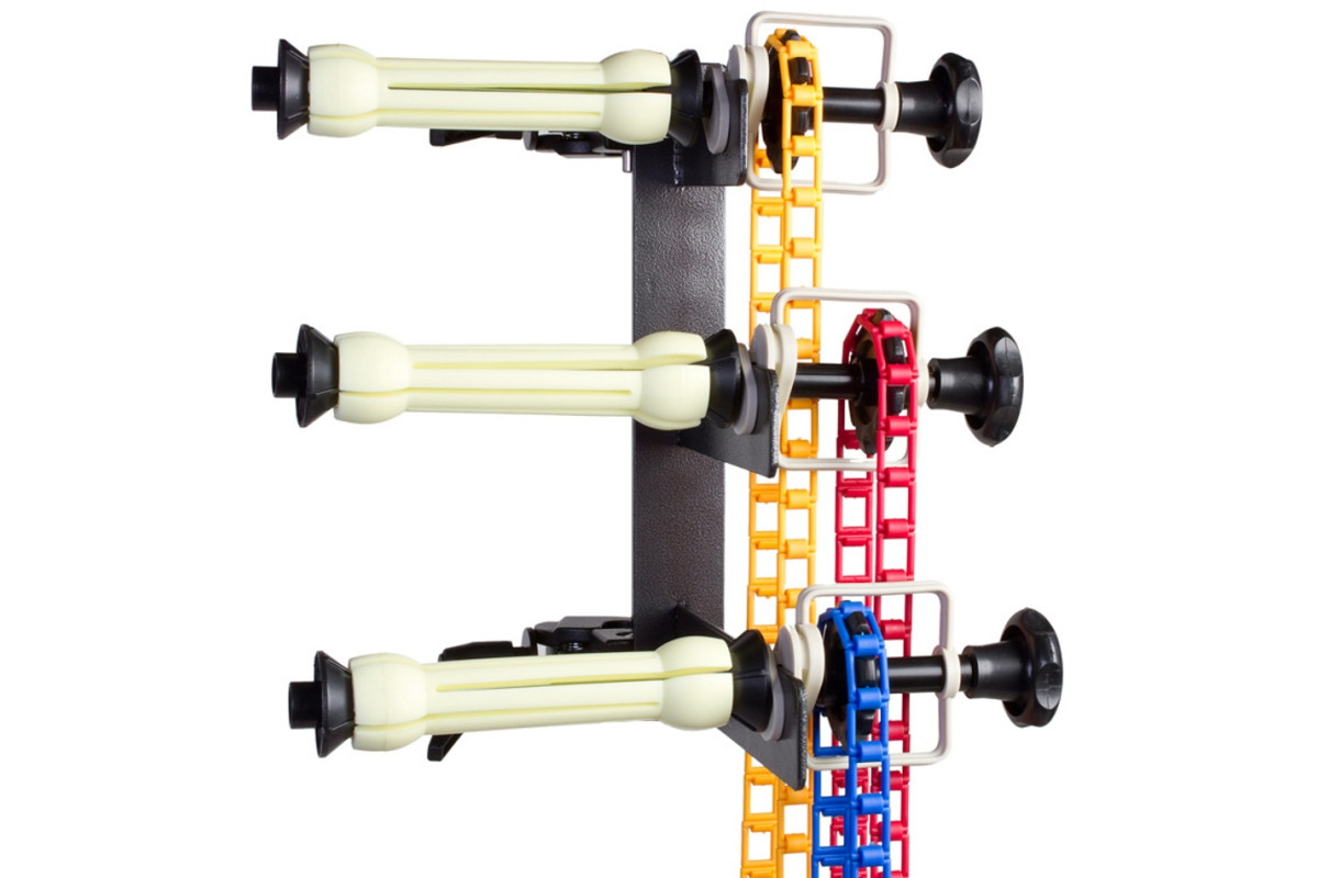 Движение каждого фона осуществляется входящими в комплект роликами с цепями. Рекомендуется для использования с бумажными фонами. Крепление к кронштейнам каждой трубы с намотанным на нее фоном, осуществляется при помощи пары цанговых зажимов, оснащенных ручным приводом для опускания/подъема фона.