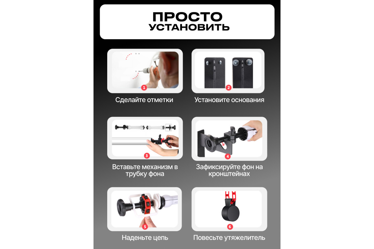 Система подъема Raylab BS-S3 для одного фона Комплект: кронштейн -2шт, цанговые зажимы - 6шт, цепь пластиковая - 3шт Raylab BS-S3 применяется для установки и подъема фонов, намотанных на трубу (втулку) с внутренним диаметром 46–78 мм. Может использоваться в фото- и видеостудиях, в том числе в домашних, при организации локальных зон для фотосессий, интервью, видео блогинга. Помогает не только оперативно разматывать или убирать рулонный фон, но и бережно его хранить, без повреждения, загрязнения и складок на полотне. Подъемник фона состоит из 8 держателей с цанговым механизмом, 2 кронштейнов, цепи и грузика-утяжелителя. Цанговый механизм (гантель) вставляется в трубку, на которую намотан фон. При повороте рукоятки держателя 4 лепестка цанги разжимаются и плотно фиксируются в трубке рулона. Держатели устанавливаются в паз кронштейнов, которые состоят из стальных пластин толщиной 4 мм. Кронштейны закрепляются на перекладинах, штангах, трубах, распорках-автополах диаметром до 35 мм. На одном держателе, входящем в комплект, находится шестерня цепной передачи с ограничителем, удерживающим цепь от соскальзывания с зубцов. На другом – упор с винтовым зажимом, исключающий перемещение рулона по горизонтали. Цепь состоит из разъемных звеньев. Ее длина от зубчатого колеса до груза – 2 метра. Убрав часть звеньев, цепь можно укоротить, чтобы сделать управление фоном более удобным. Грузик с направляющими для звеньев утяжеляет цепь, чтобы она висела ровно, не раскачивалась и не запутывалась. Система Raylab BS-S1 используется для подъема одного фона. На работу с несколькими фонами рассчитаны системы аналогичной конструкции BS-S1, BS-D2 и BS-S4.