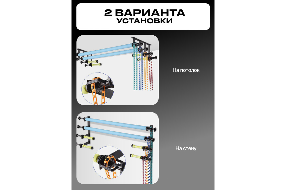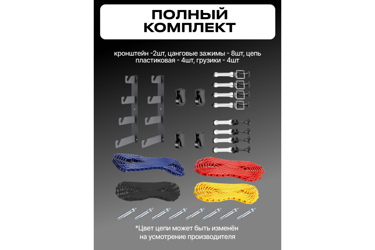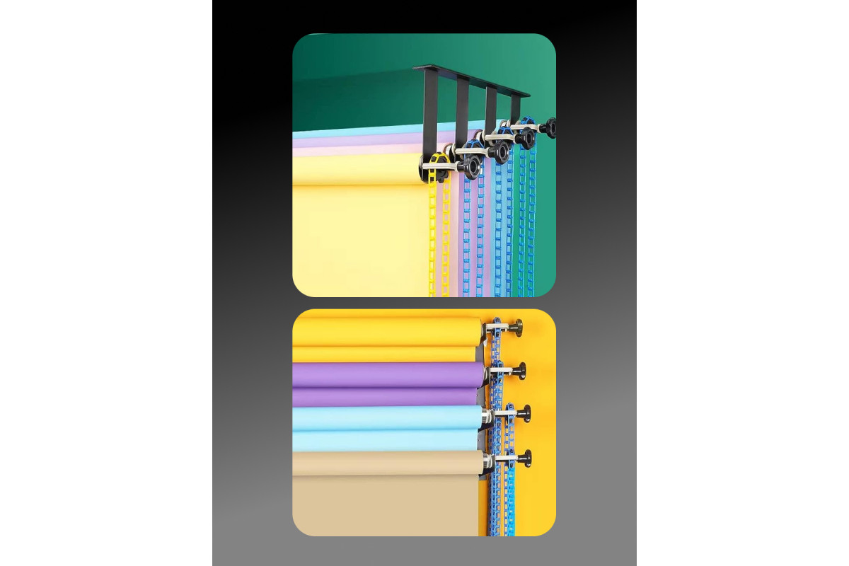 Система подъема Raylab BS-S4 для четырёх фонов Комплект: кронштейн -2шт, цанговые зажимы - 8шт, цепь пластиковая - 4шт Raylab BS-S4 применяется для установки и подъема фонов, намотанных на трубу (втулку) с внутренним диаметром 46–78 мм. Может использоваться в фото- и видеостудиях, в том числе в домашних, при организации локальных зон для фотосессий, интервью, видео блогинга. Помогает не только оперативно разматывать или убирать рулонный фон, но и бережно его хранить, без повреждения, загрязнения и складок на полотне. Подъемник фона состоит из 8 держателей с цанговым механизмом, 2 кронштейнов, цепи и грузика-утяжелителя. Цанговый механизм (гантель) вставляется в трубку, на которую намотан фон. При повороте рукоятки держателя 4 лепестка цанги разжимаются и плотно фиксируются в трубке рулона. Держатели устанавливаются в паз кронштейнов, которые состоят из стальных пластин толщиной 4 мм. Кронштейны закрепляются на перекладинах, штангах, трубах, распорках-автополах диаметром до 35 мм. На одном держателе, входящем в комплект, находится шестерня цепной передачи с ограничителем, удерживающим цепь от соскальзывания с зубцов. На другом – упор с винтовым зажимом, исключающий перемещение рулона по горизонтали. Цепь состоит из разъемных звеньев. Ее длина от зубчатого колеса до груза – 2 метра. Убрав часть звеньев, цепь можно укоротить, чтобы сделать управление фоном более удобным. Грузик с направляющими для звеньев утяжеляет цепь, чтобы она висела ровно, не раскачивалась и не запутывалась. Система Raylab BS-S4 используется для подъема одного фона. На работу с несколькими фонами рассчитаны системы аналогичной конструкции BS-S1, BS-D2 и BS-S3.