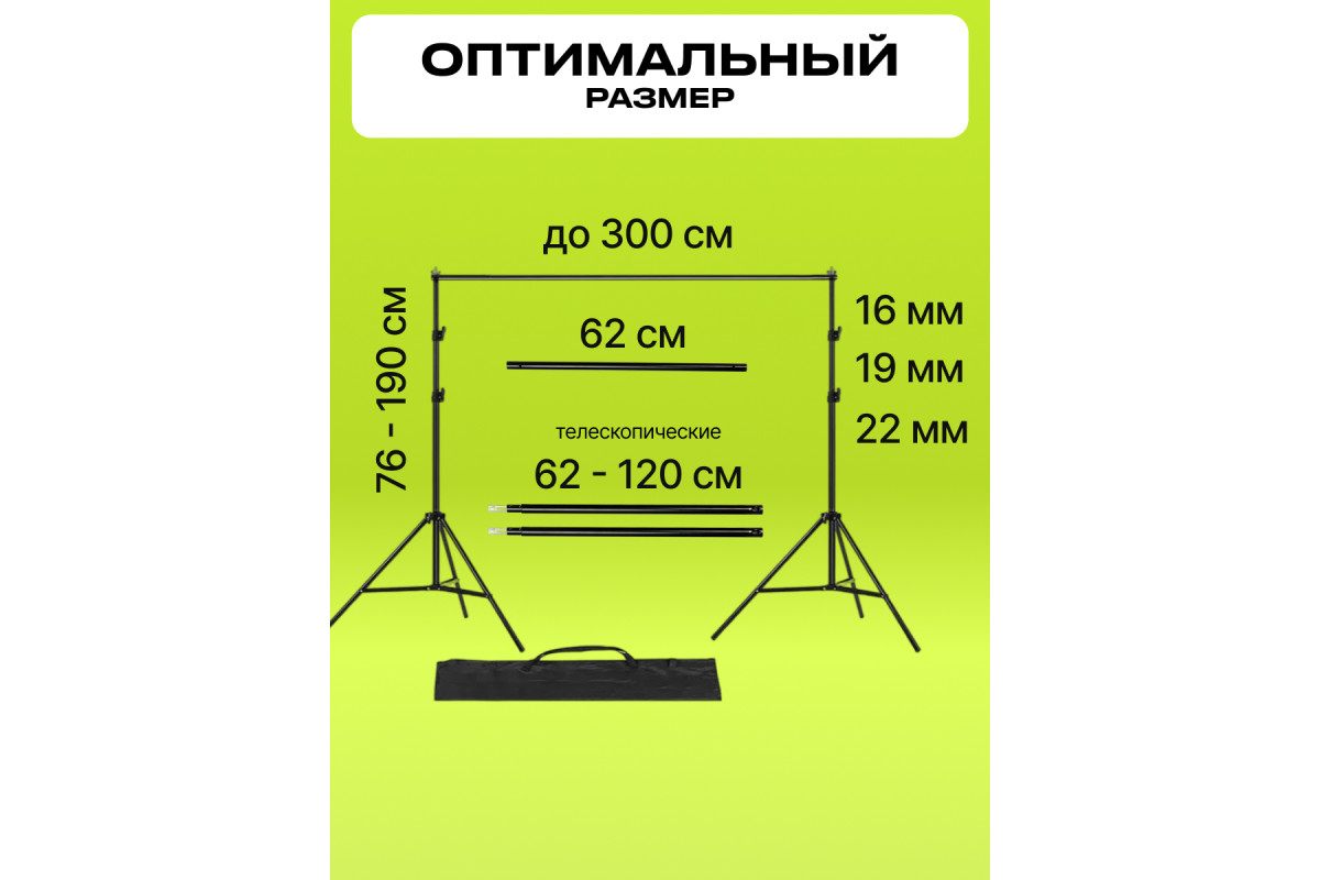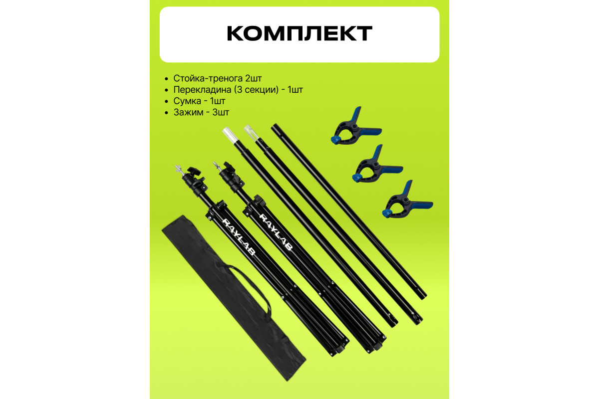 Система установки фона Raylab B2030E Система установки для тканевых или других легких фонов поставляется в комплекте из двух стоек, раздвижной перекладины и сумки. Разборная конструкция укладывается в сумку для переноски. Материал: сталь. Комплектация: стойка - 2 шт., перекладина - 1 шт., сумка - 1 шт Система установки фонов типа ворота - это идеальное решение для гпчинающих и профессиональных фотографов, которые хотят быстро и легко устанавливать фоны для съемок. Система установки фона от Raylab предоставляет удобное и быстрое решение для поддержания фотофона в нужном положении. Это особенно важно при работе с различными декорациями или фонами для создания разнообразных эффектов в ваших фотографиях. Держатели для фона и системы установки фонов соответствуют высоким стандартам, обеспечивая надежную и долговечную работу. Стойка для фотофона оптимизирует ваши фотосессии! Надежный, функциональный и стильный, держатель фотофона Raylab станет незаменимым помощником в вашей работе, позволяя вам сосредоточиться на творческом процессе и получить потрясающие фотографии.