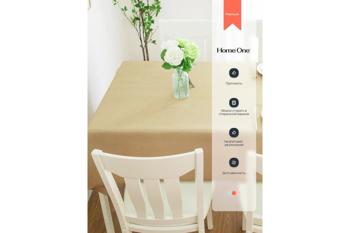 Скатерть Home One с приятной текстурой материала и лаконичным дизайном прекрасно впишется в интерьер любой кухни или столовой. Скатерть имеет водоотталкивающие свойства, ее поверхность не выделяет неприятного запаха, легко чистится, не впитывает загрязнения. Скатерть изготовлена из полиэстера, который придает изделию прочность и долговечность, долго сохраняет форму и внешний вид изделия, можно стирать в стиральной машине, быстро сохнет. Размер изделия 213*150 см.