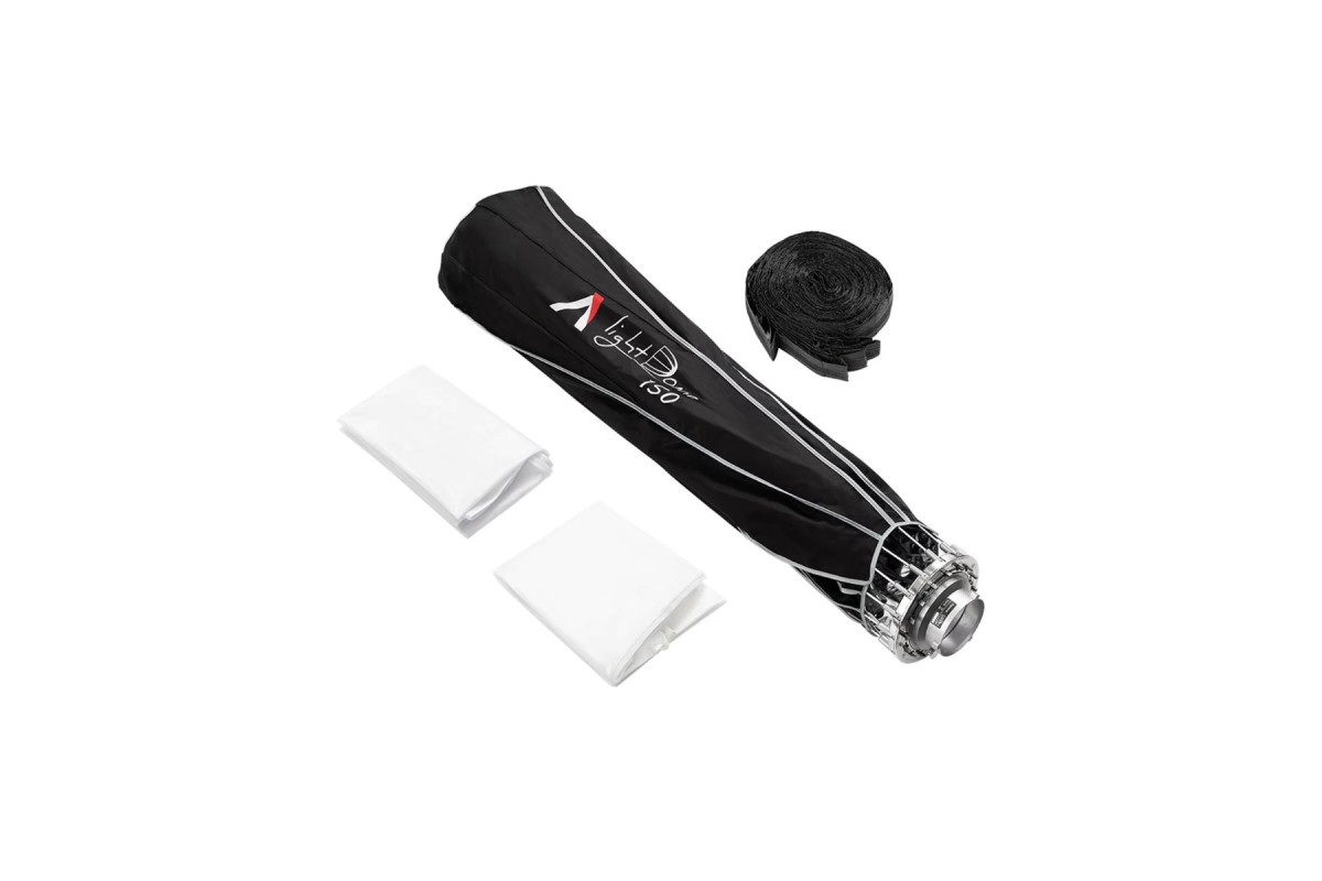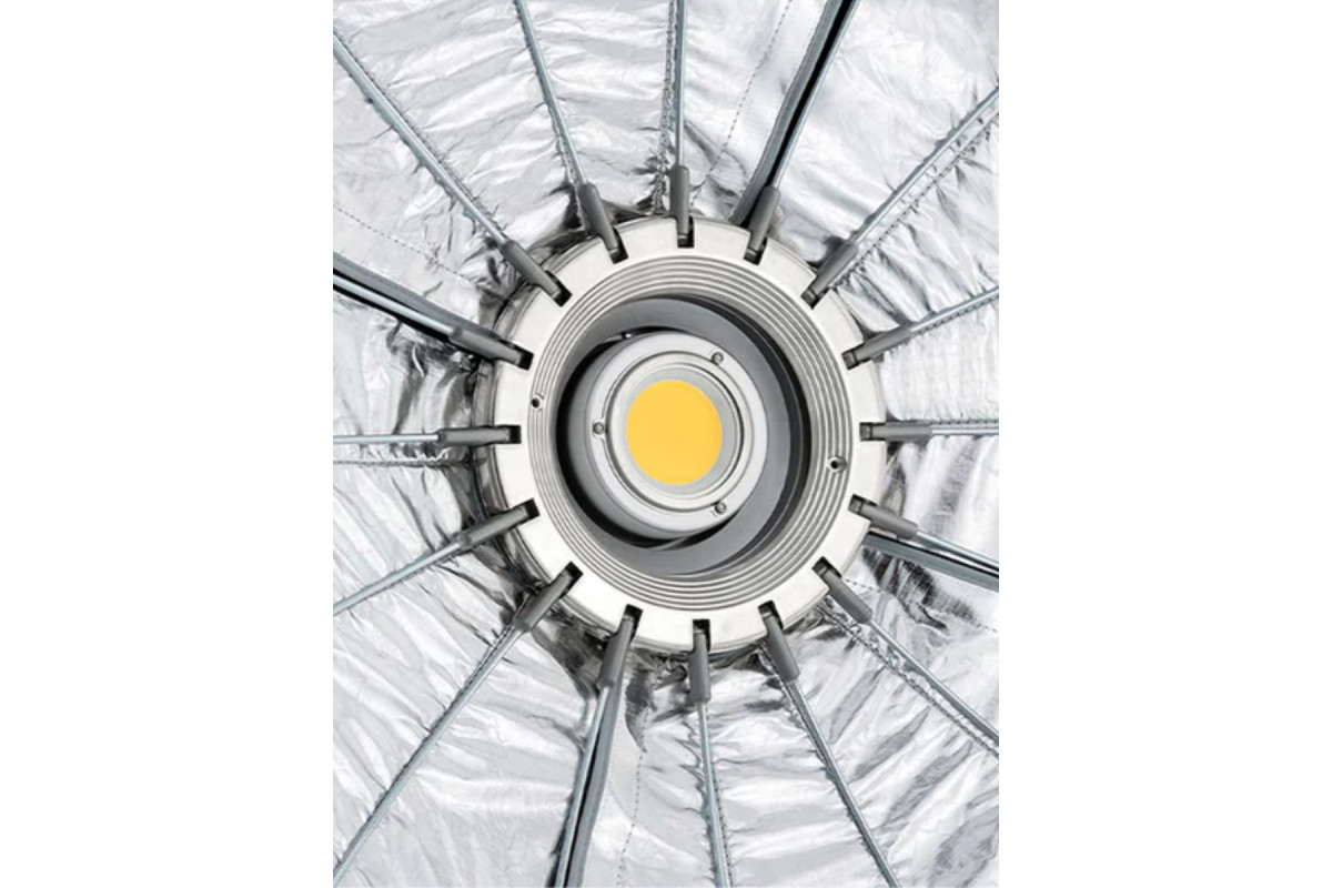 Использование 32-ти стержневой системы позволило создать правильную и симметричную округлую форму этого софтбокса. Аппарат можно установить на освещение имеющее крепление типа Bowen
