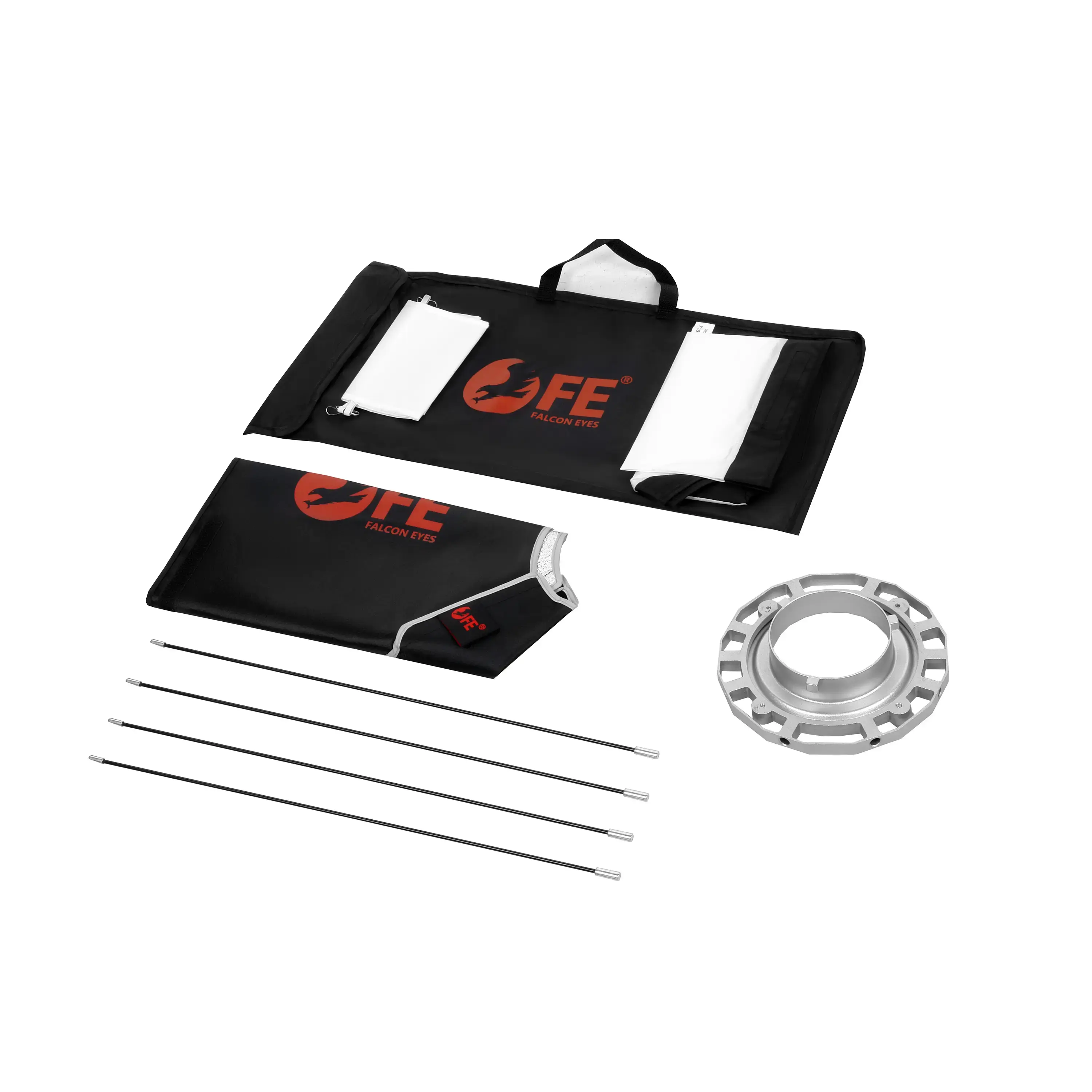 Световой модификатор состоит из тента-отражателя, внешнего и внутреннего тканевых рассеивателей (диффузоров), байонетного кольца (крепления) и четырех стальных спиц. В комплект также входит чехол для хранения и транспортировки софтбокса.