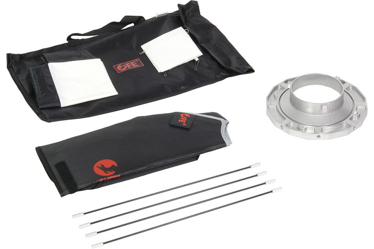 Устройство состоит из отражателя, внешнего и внутреннего рассеивателя, несущего каркаса (литой алюминиевый адаптер и сменное байонетное кольцо на Bowens). Для установки FEA-SB 4545 BW на осветительные приборы с другим байонетом можно использовать переходные кольца(приобретаются отдельно, диаметр 145 мм).
