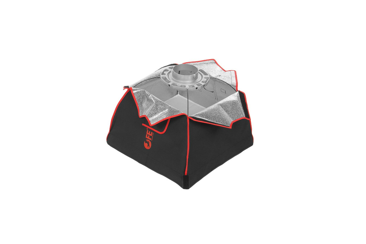 Каркас софтбокса выполнен из качественной жаропрочной синтетической ткани с серебристой поверхностью, рассчитанной на длительную эксплуатацию при интенсивной работе в студии. Плотная ткань каркаса позволяет избежать нежелательных бликов и потерь светового потока, что бывает заметно у софтбоксов нежаропрочного типа (особенно в зоне крепления источника света).