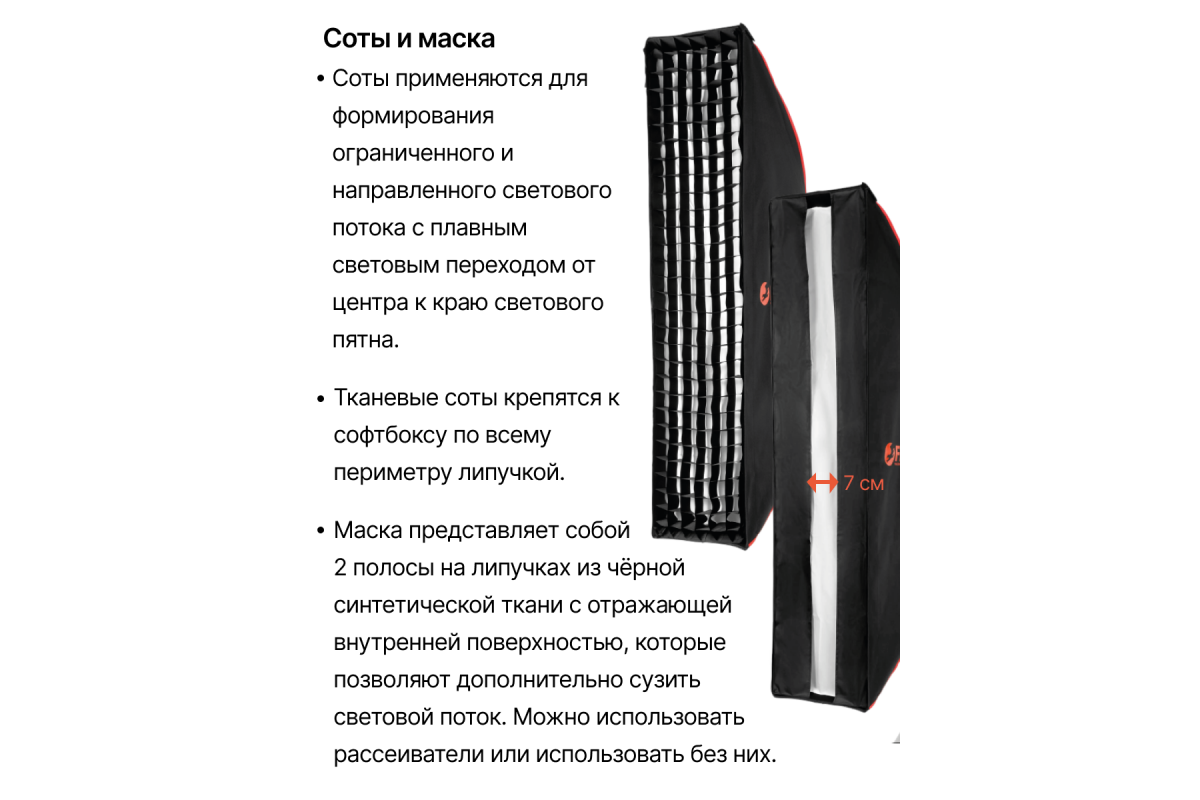 Сотовая насадка применяется для формирования ограниченного и направленного светового потока с плавным светотеневым переходом от центра к краю светового пятна. Тканевые соты крепятся к «козырьку» софтбокса по всему периметру с помощью липучки.