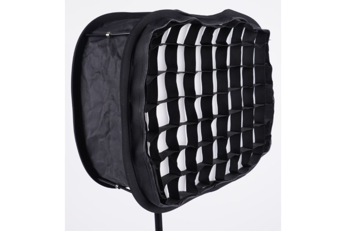 Складной софтбокс на пружине. Оборудован внешним рассеивателем и сотами для создания более мягкого и более направленного светового потока. Мягкий чехол в комплекте.