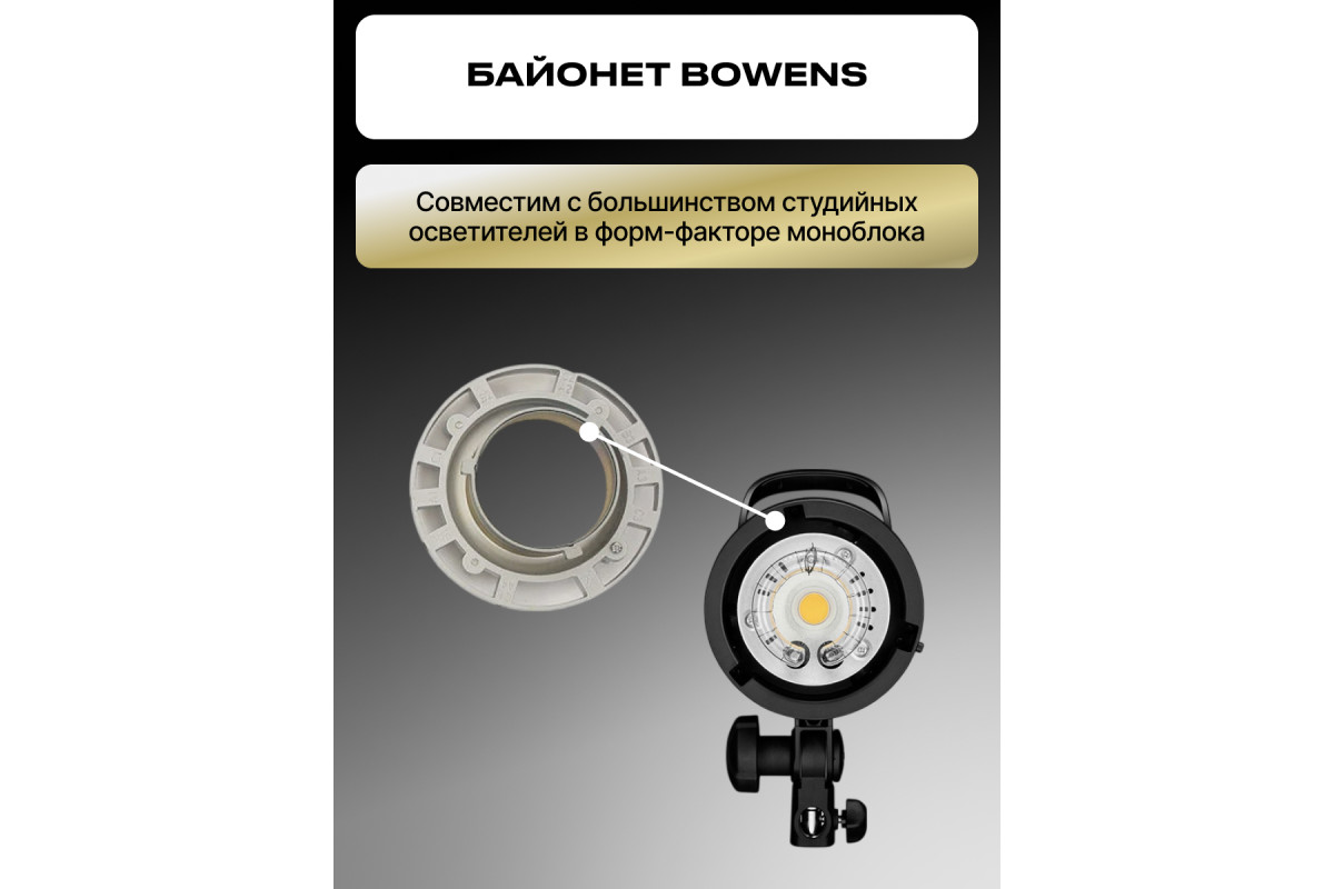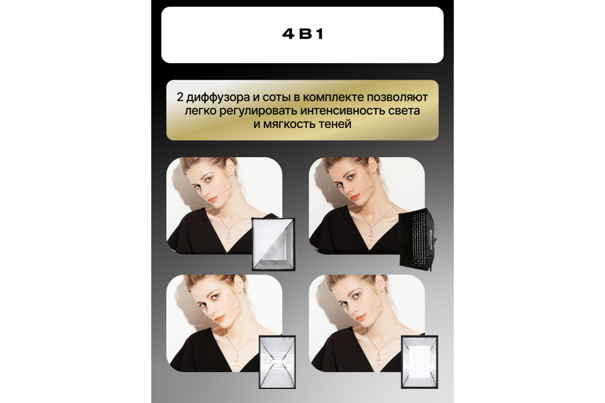 Устройство состоит из отражателя, внешнего и внутреннего рассеивателя с UV покрытием, несущего каркаса (литой алюминиевый адаптер и сменное байонетное кольцо на Bowens), и сотовой насадки.