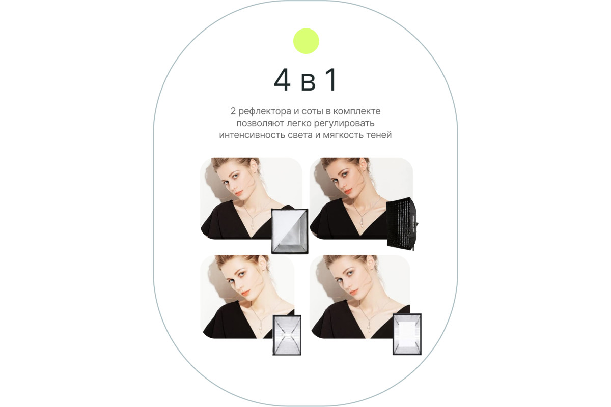 Закрытая конструкция позволяет избежать нежелательных бликов и потерь светового потока. Отражатель, с серебристой тканью внутри, обеспечивает равномерную засветку рассеивателя, который в свою очередь, благодаря большой поверхности, смягчает формируемые тени. Дополнительный внутренний диффузор улучшает равномерность светового потока. Наконечники на упругих металлических спицах не повреждают тканевые спицедержатели софтбокса и облегчают сборку конструкции.