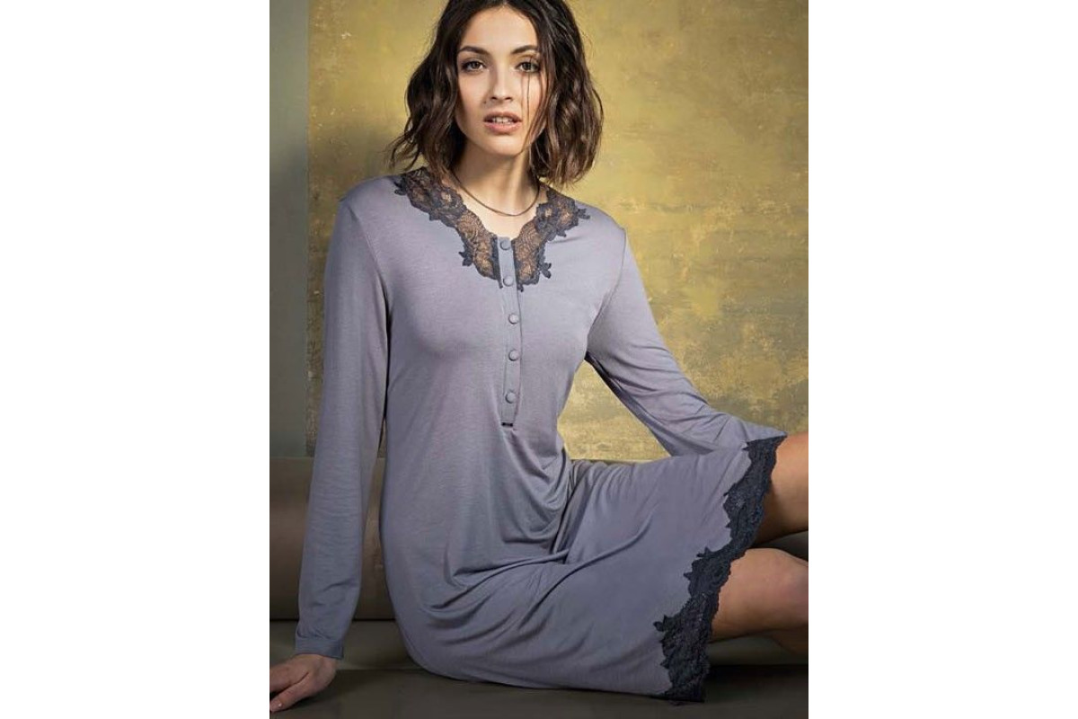 Ночная рубашка Lormar champagne/visone 635231 с длинными рукавами с вырезом на 5 пуговицах и длиной до колена, выполнена из вискозы стрейч с кружевом
