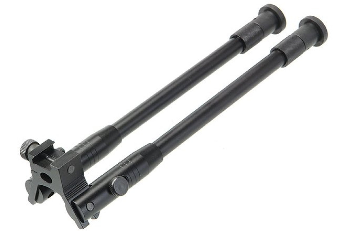 Складные двухсекционные сошки Veber 2227A. Основание — цельное, прочное и неподвижное крепится на ствол винтовки диаметром 11–19 мм. Пружинный амортизатор эффективно гасит удары и вибрацию обеспечивая устойчивую опору для ведения огня. Идеально подходит для стрельбы сидя или лёжа. Ножки с фиксаторами положения быстро и легко складываются. Изготовлены из прочного алюминиевого сплава. Наконечники ножек с обрезиненными наконечниками.