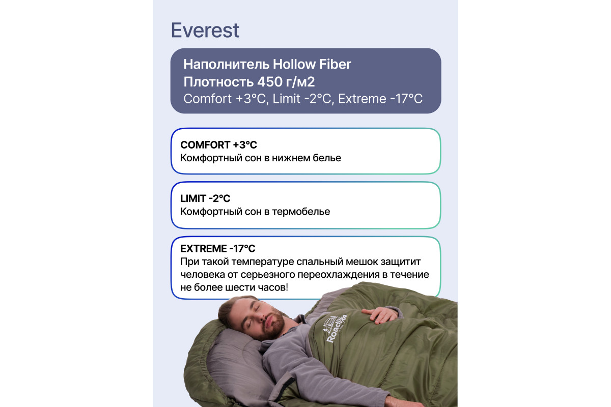 Спальный мешок имеет дышащую подкладку из поликоттона (50% хлопок, 50% полиэстер), которая приятна к телу и обеспечивает комфортный сон. При температуре +3°C вы можете спать в нижнем белье, а при -2°C — в термобелье. В экстремальных условиях до -17°C он защитит от переохлаждения в течение шести часов.