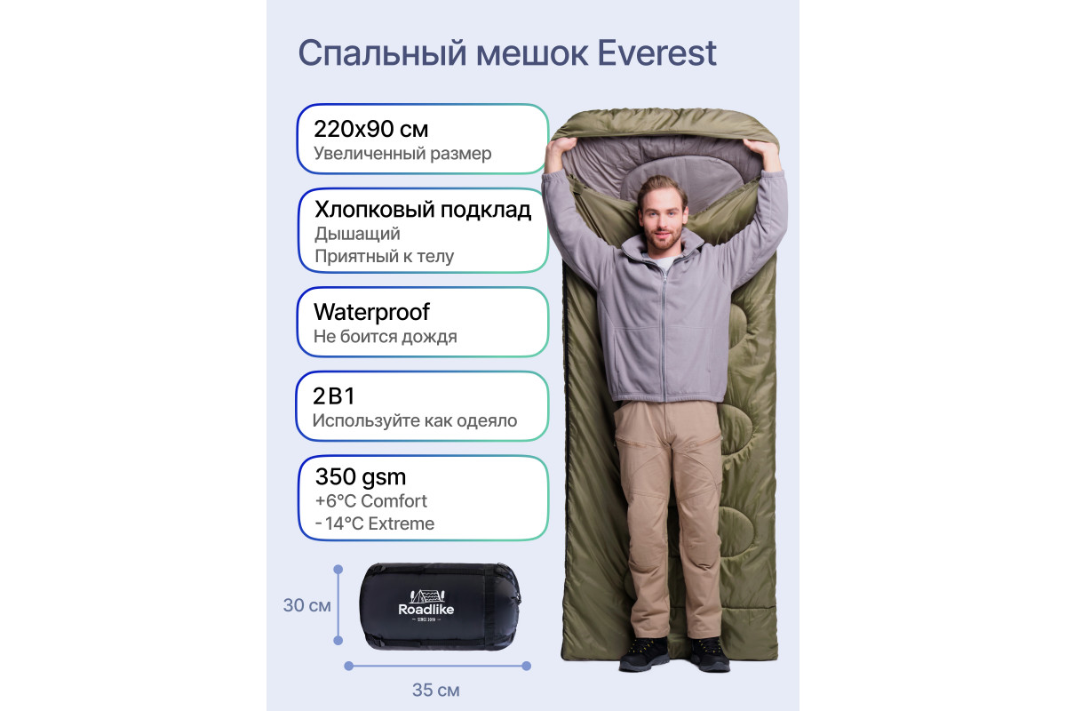 • 2В1: Спальный мешок можно использовать как большое одеяло — постелите один спальник вниз, а вторым укройтесь.