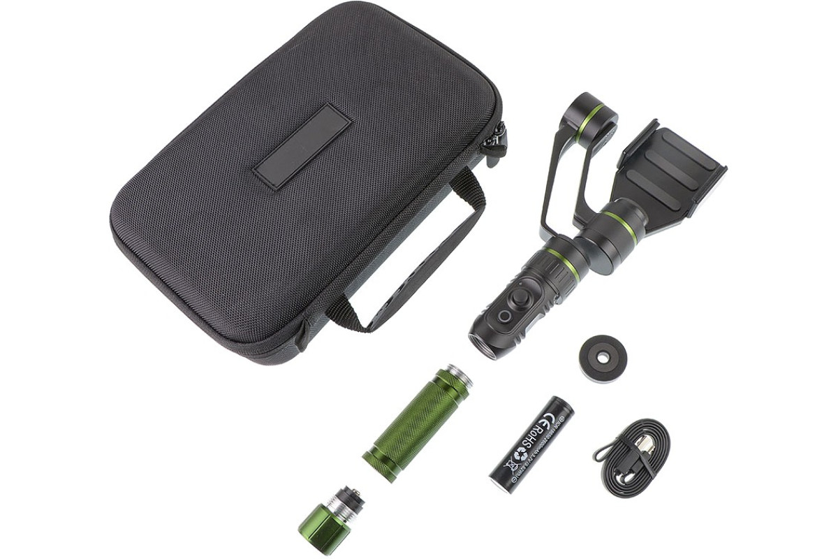 Дизайн интегрированной панели управления разработан таким образом, что позволяет управлять стабилизатором и мобильной камерой при помощи кнопок, практически не используя сенсорный экран. Благодаря продвинутому программному обеспечению, он корректно обрабатывает такие «сложные» положения для электронных стедикамов, как наклон ручки на 45 градусов, или близкое к соосности расположение двух моторов. А за счёт применения высококачественных и точно изготовленных подшипников вы будете избавлены от проблем с вибрациями, гудением, различными шумами и прочими дефектами, свойственными многим более простым моделям. Корпус стабилизатора изготовлен из алюминиевого сплава, на рукоятку присутствует насечка для лучшего удержания.