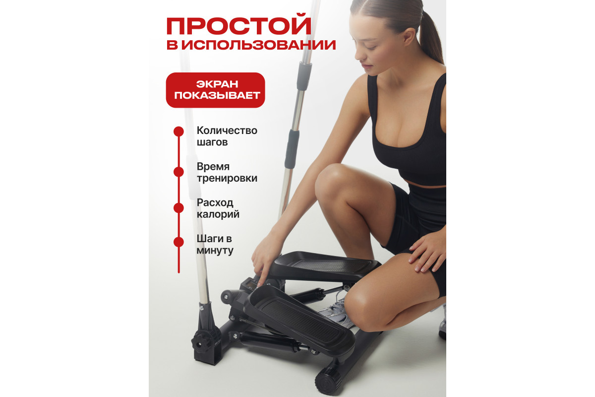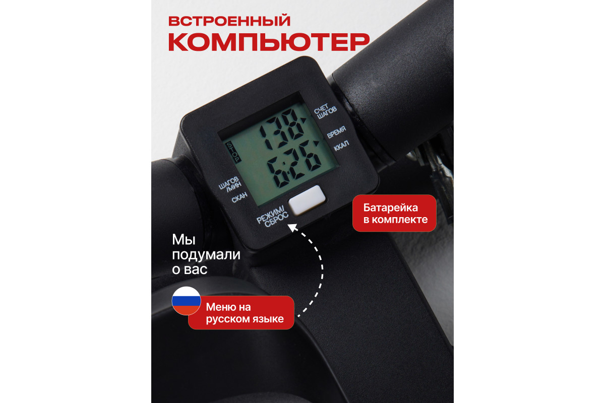 • Цифровой дисплей на русском языке: отслеживает время тренировки, количество шагов, кол-во шагов в минуту и сожженные калории.