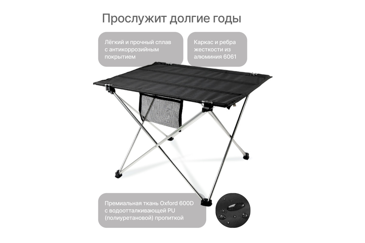 Стол складной туристический RoadLike Solo - размер 56*41*37 см (S). Удобный туристический стол для походов, кемпингов, выездов на природу, отличное решения для отдыха в саду и на даче. Стол раскладной из водоотталкивающего материала Oxford 600D, быстро сохнет и не впитывает влагу. Устойчива и надежная конструкция за счет высокопрочной алюминиевой рамы! Для максимального комфортна складной стол RoadLike Solo снабжен карманом для самых важных мелочей. Компактный размер в сложенном виде и удобный чехол для хранения позволит чувствовать себя в комфорте в любом путешествии! Размер в разложенном виде: 56х41х37см. Размер в сложенном виде: 56х8х6,5см. Материал каркаса: высокопрочный алюминий с антикоррозионным покрытием. Материал столешницы: высокопрочная ткань Oxford 600D. В комплекте туристического стола S: разборный каркас, съемная столешница, сумка для хранения.
