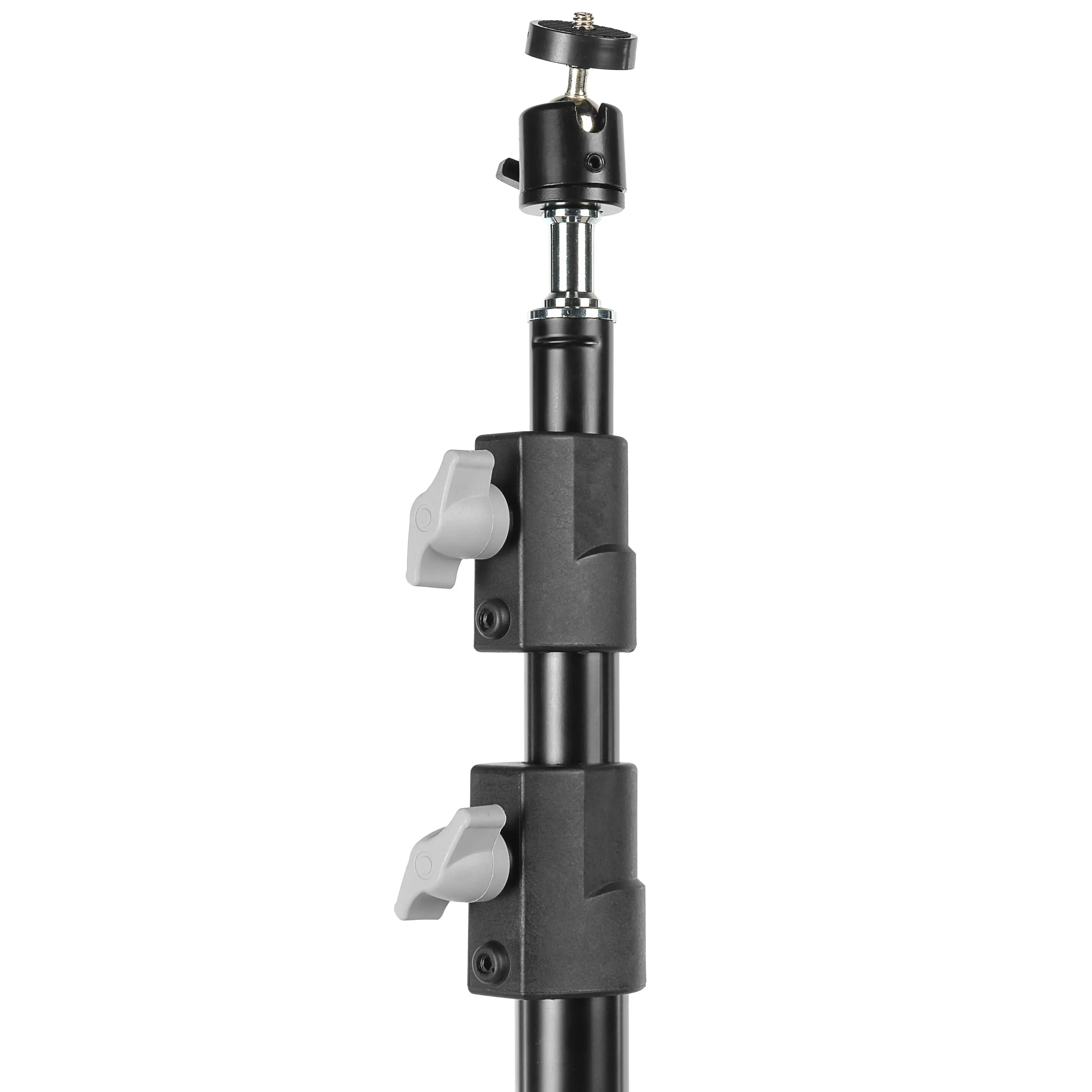 Телескопическая колонна стойки разделена на три секции большого диаметра, что позволяет значительно увеличить общую высоту без потери стабильности и жесткости конструкции. Прочные полимерные зажимы надежно фиксируют каждый сегмент, защищая механизмы от износа и обеспечивая плавное движение секций.