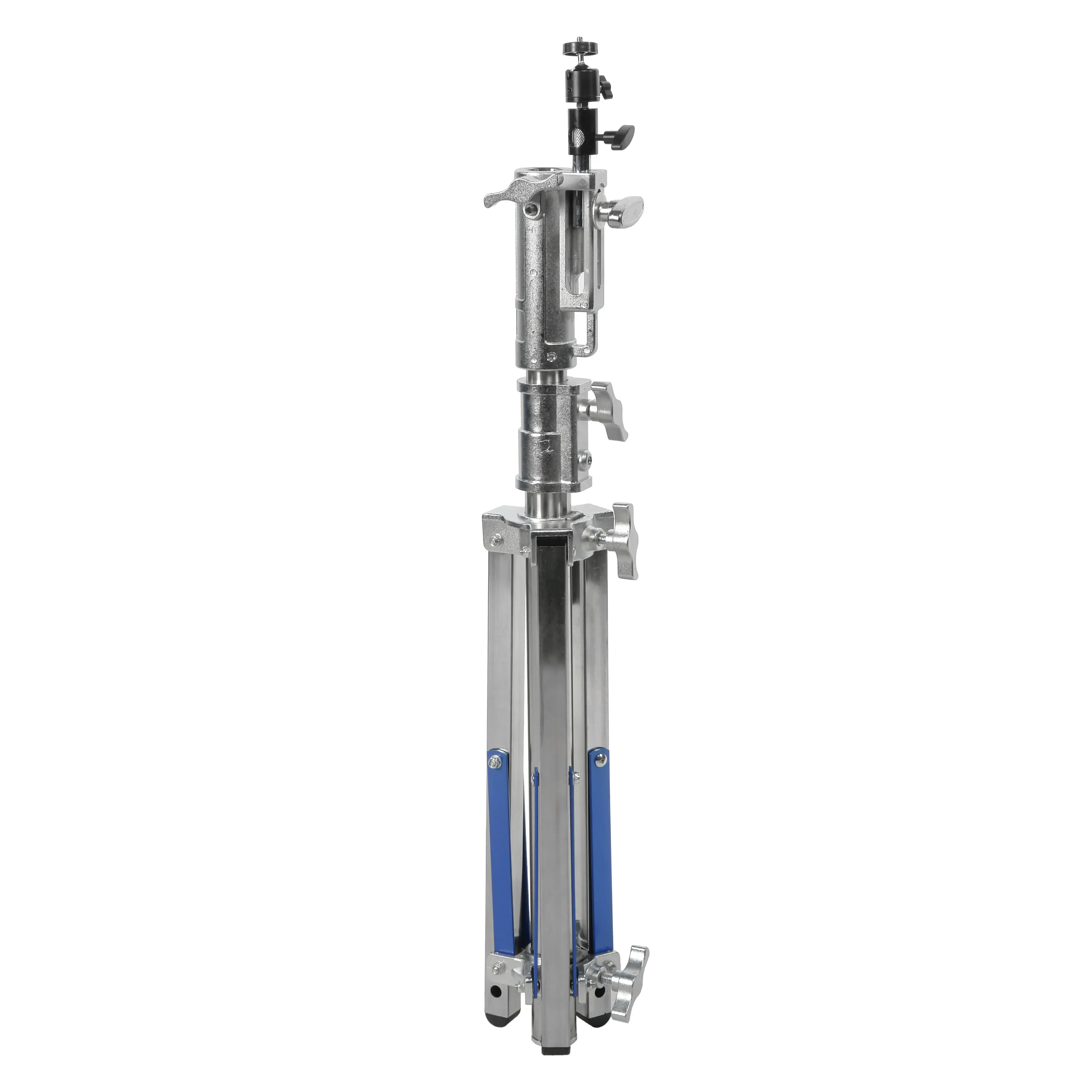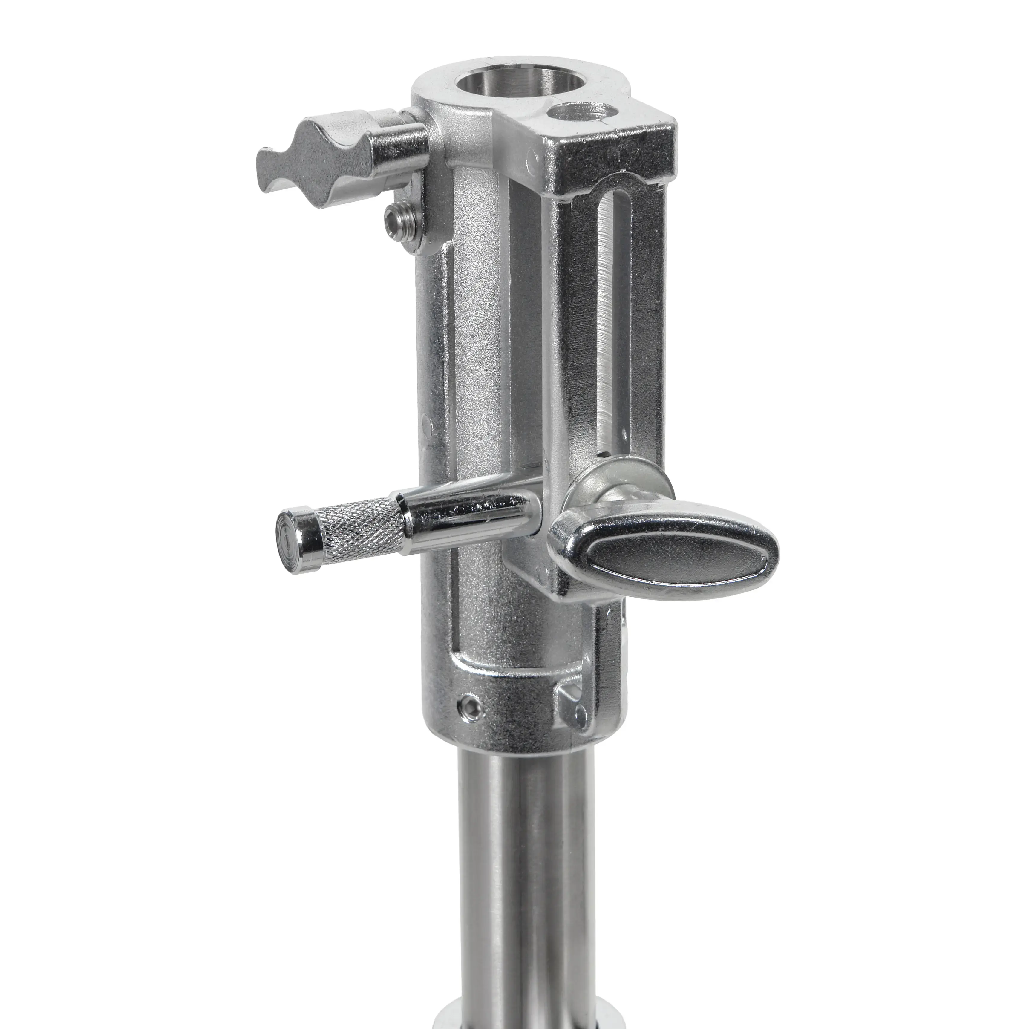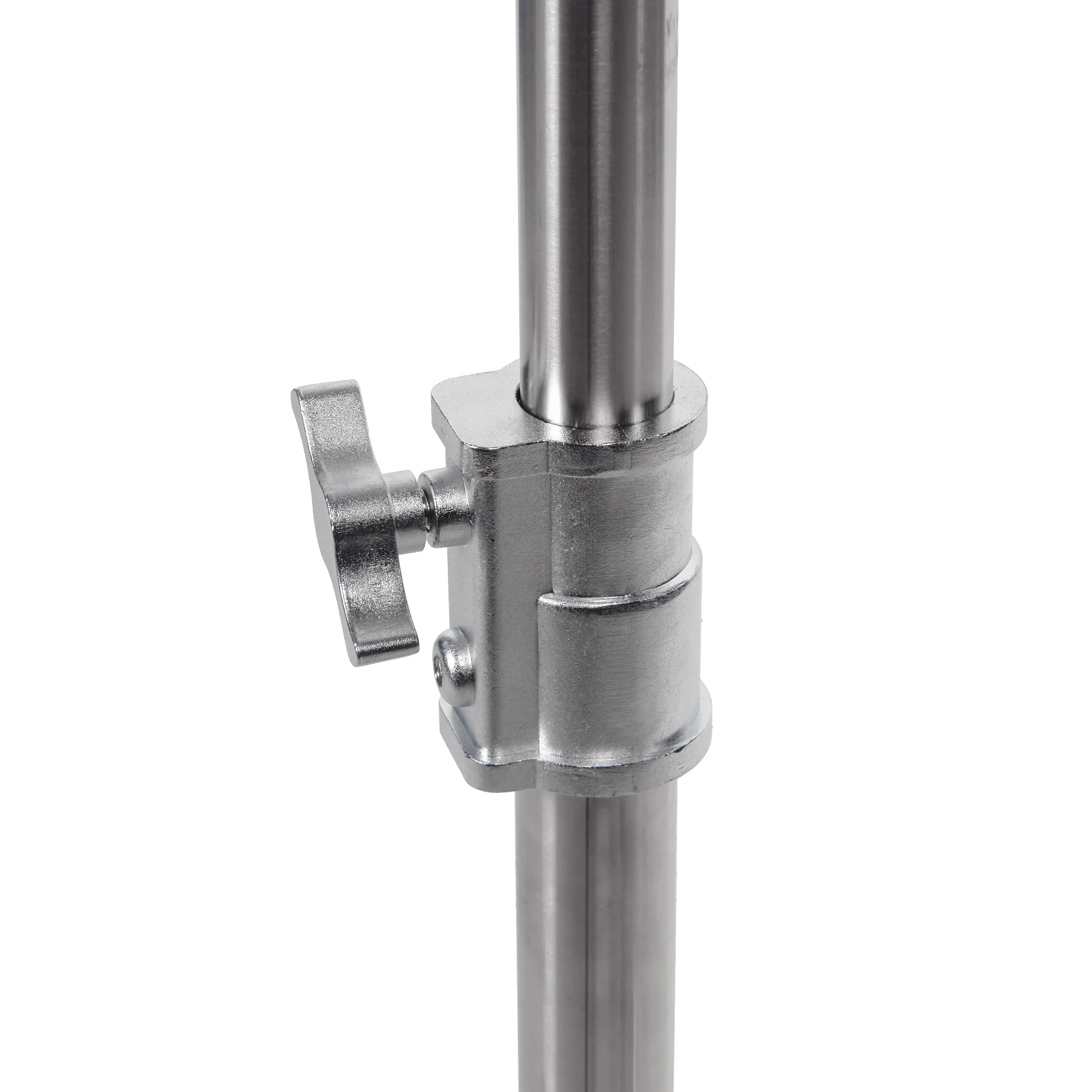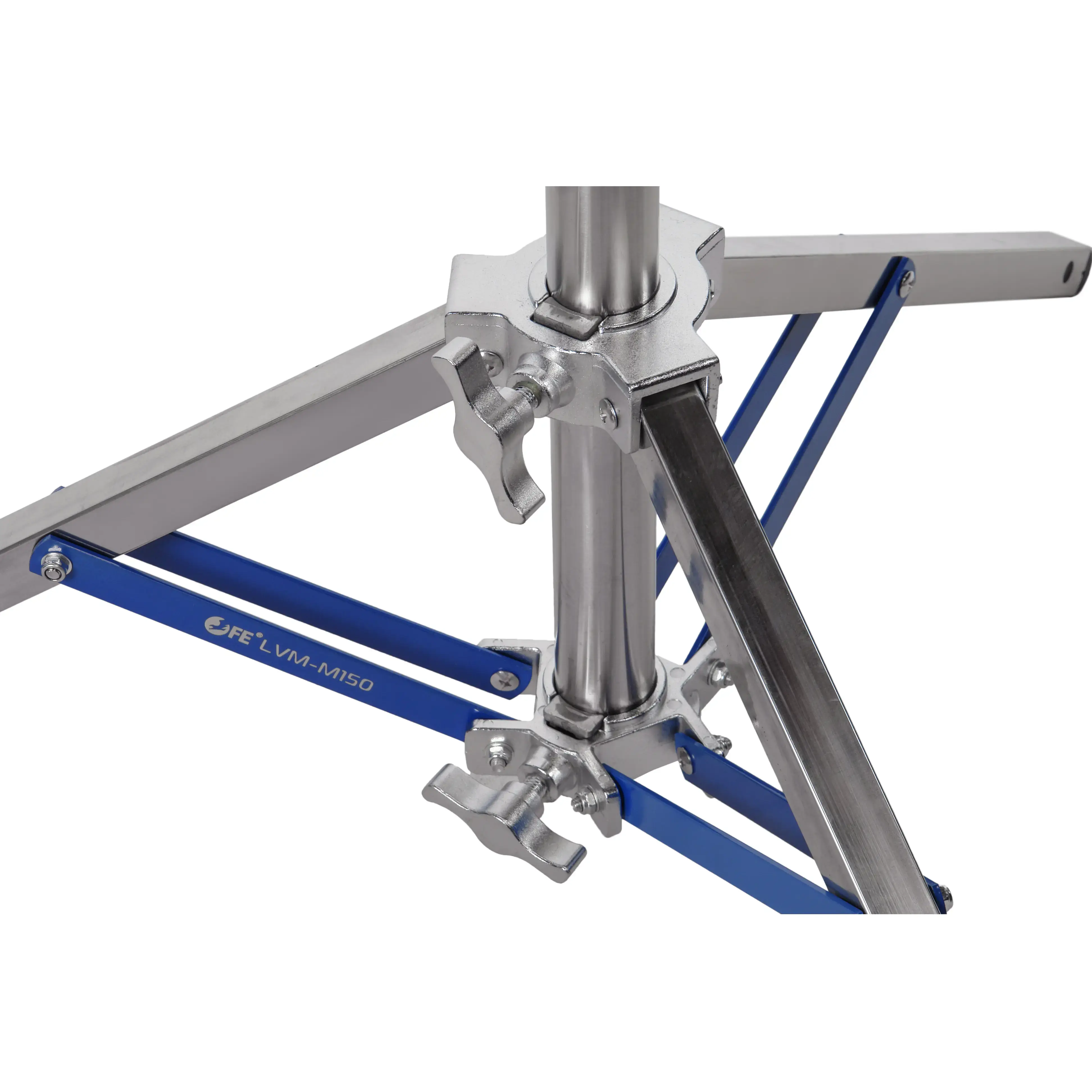 Стойка изготовлена из цельной стали, что гарантирует жесткость и устойчивость при полной нагрузке. Телескопическая двухсекционная колонна на треноге достигает максимальной высоты 150 см. Большой диаметр секций (40/35 мм) обеспечивает оптимальную жесткость и распределение нагрузки, минимизируя раскачивание. Секции надежно фиксируются усиленным винтовым зажимом.
