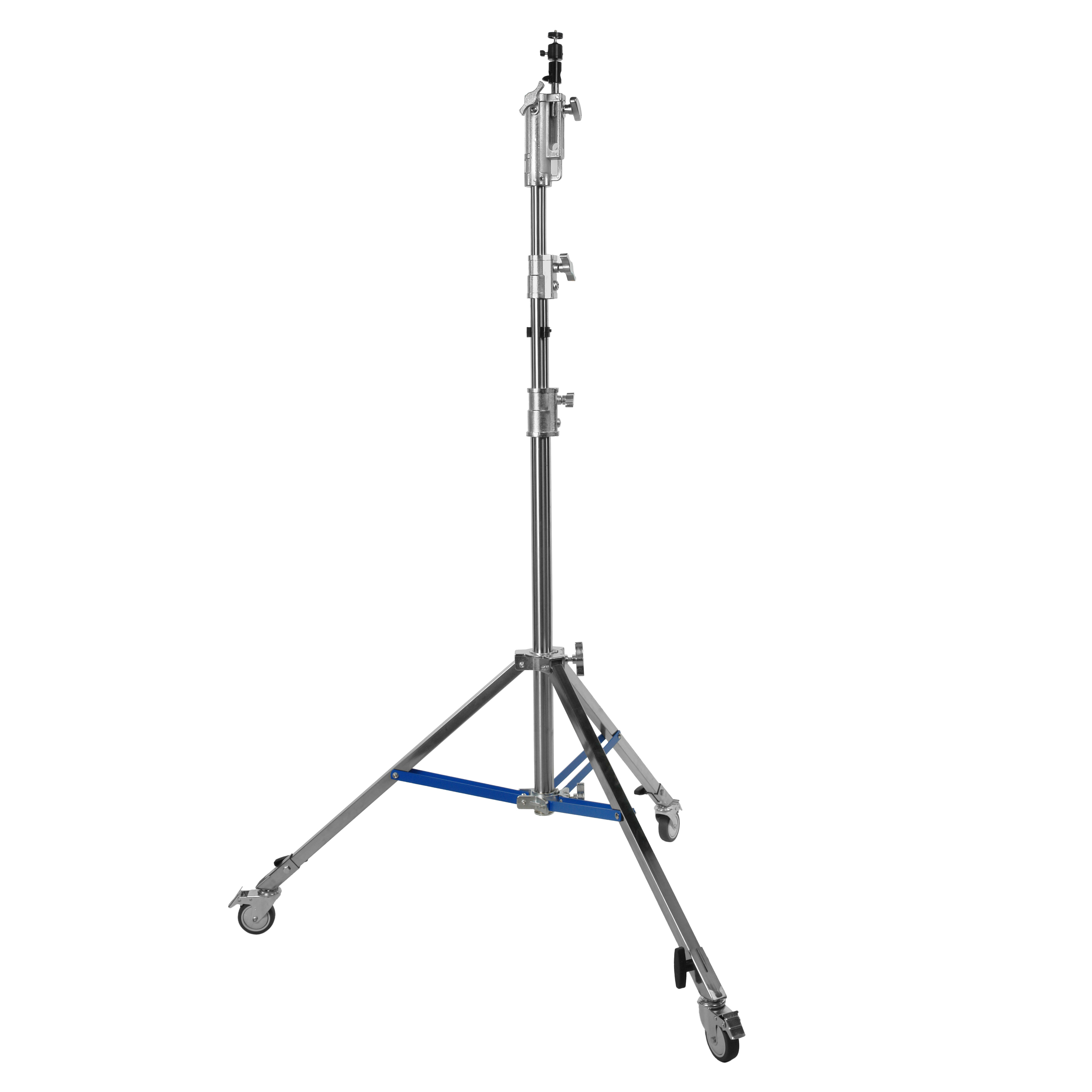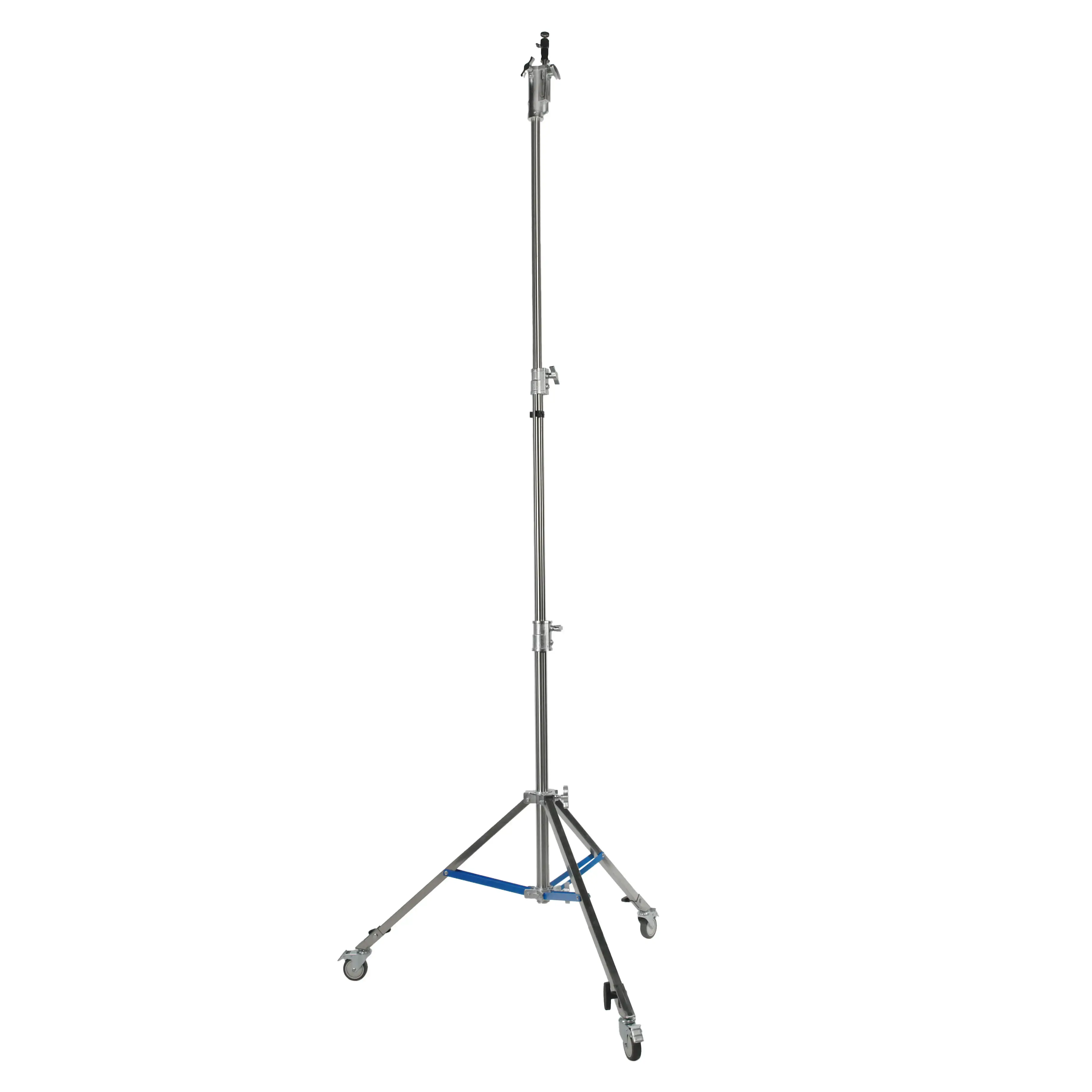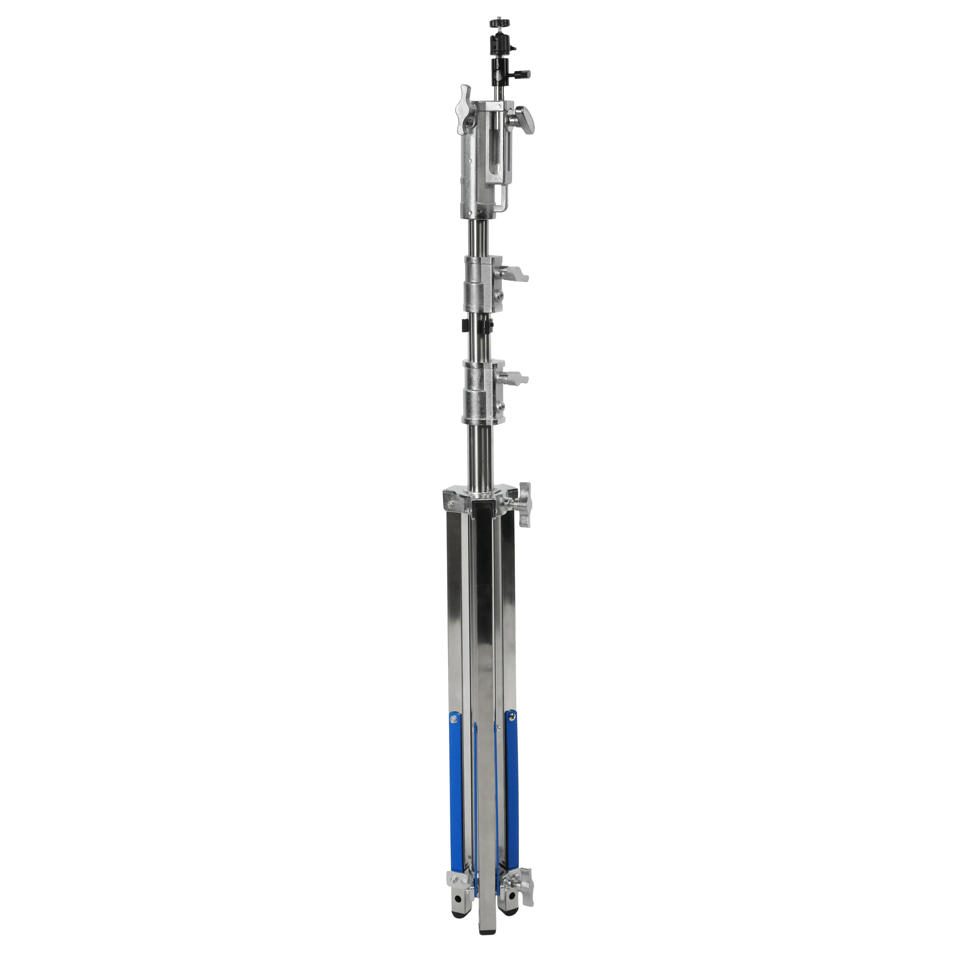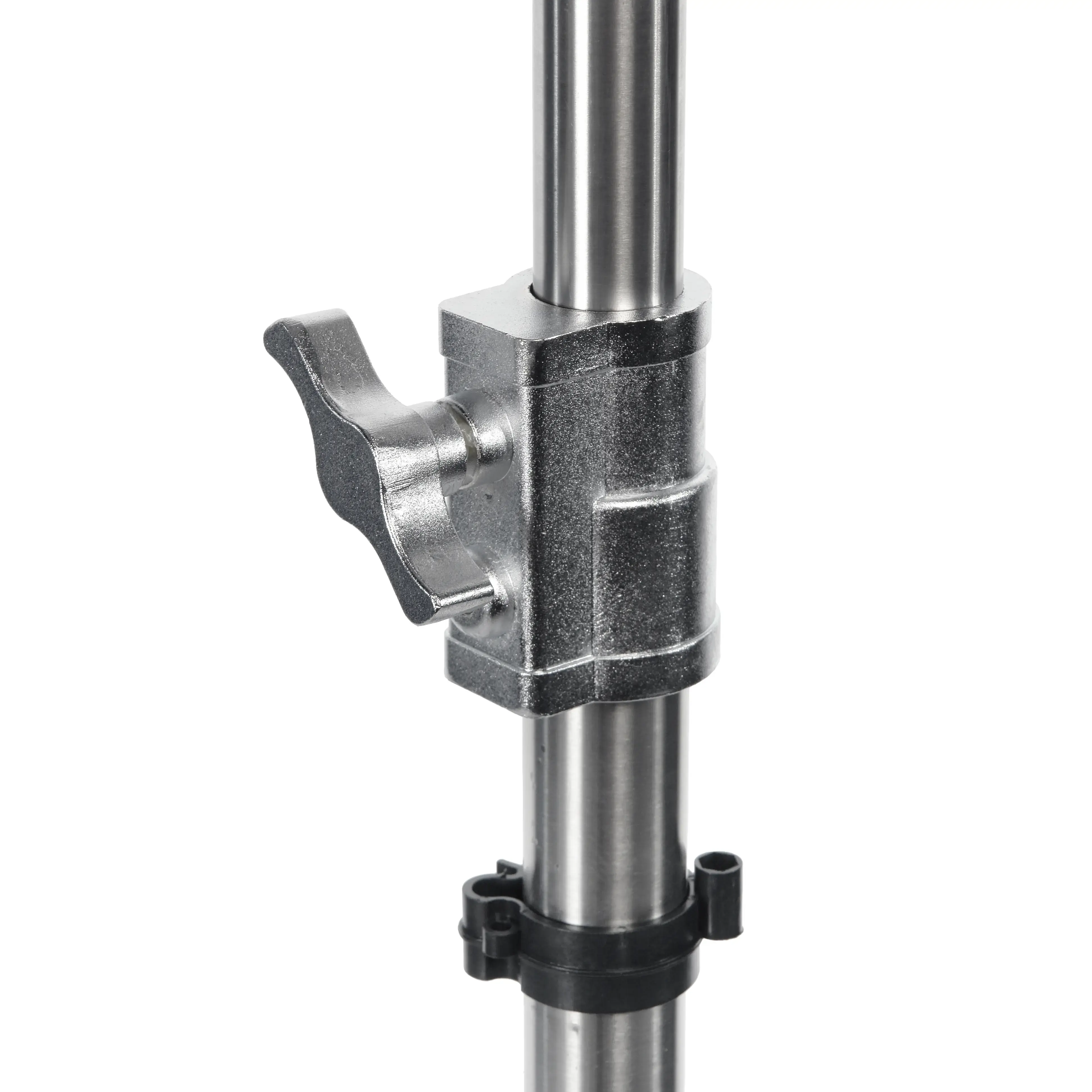 Стойка изготовлена из цельной стали, что гарантирует жесткость и устойчивость при полной нагрузке. Телескопическая трехсекционная колонна на треноге достигает максимальной высоты 350 см. Большой диаметр секций (40/35/30 мм) обеспечивает оптимальную жесткость и распределение нагрузки, минимизируя раскачивание. Каждая секция надежно фиксируется усиленными винтовыми зажимами.