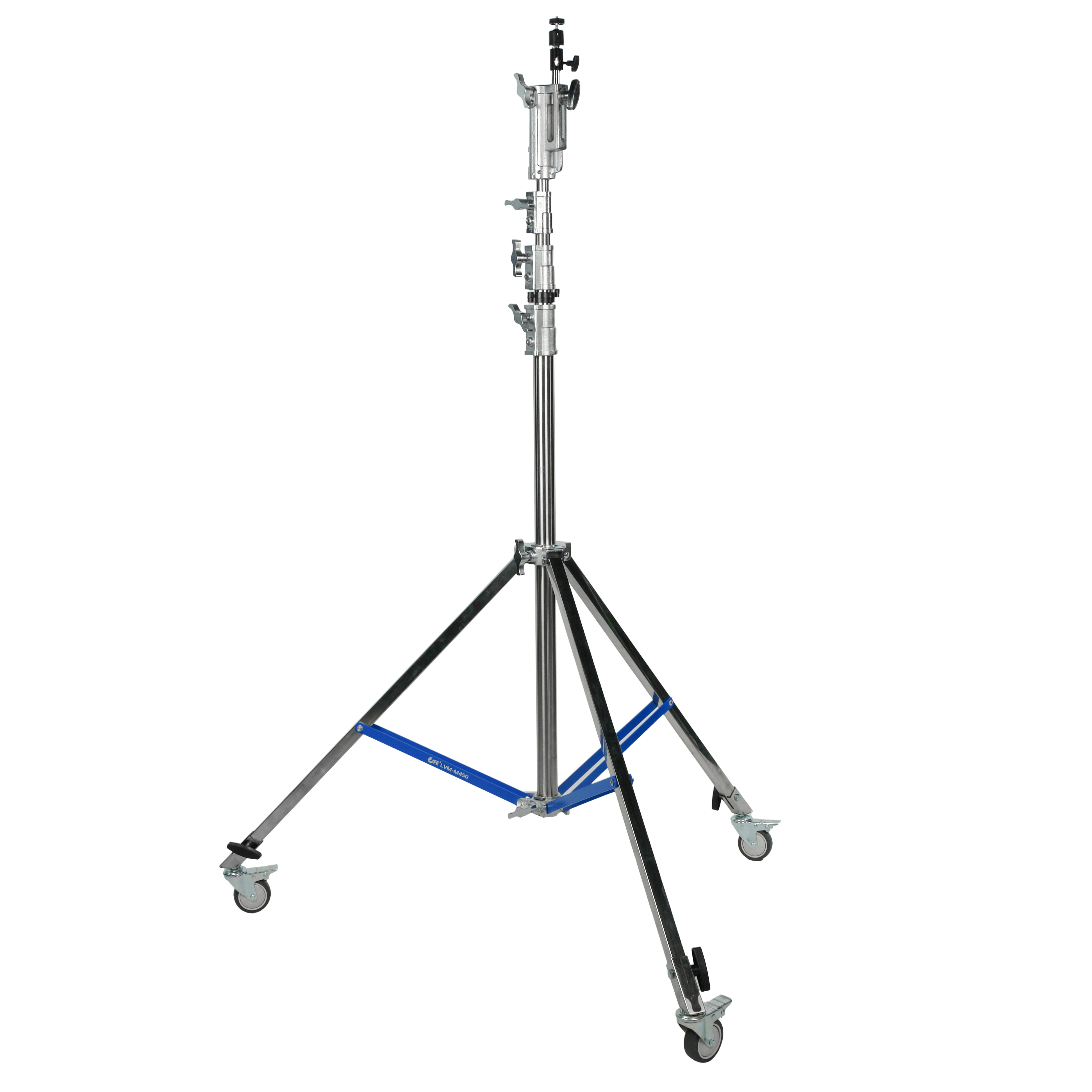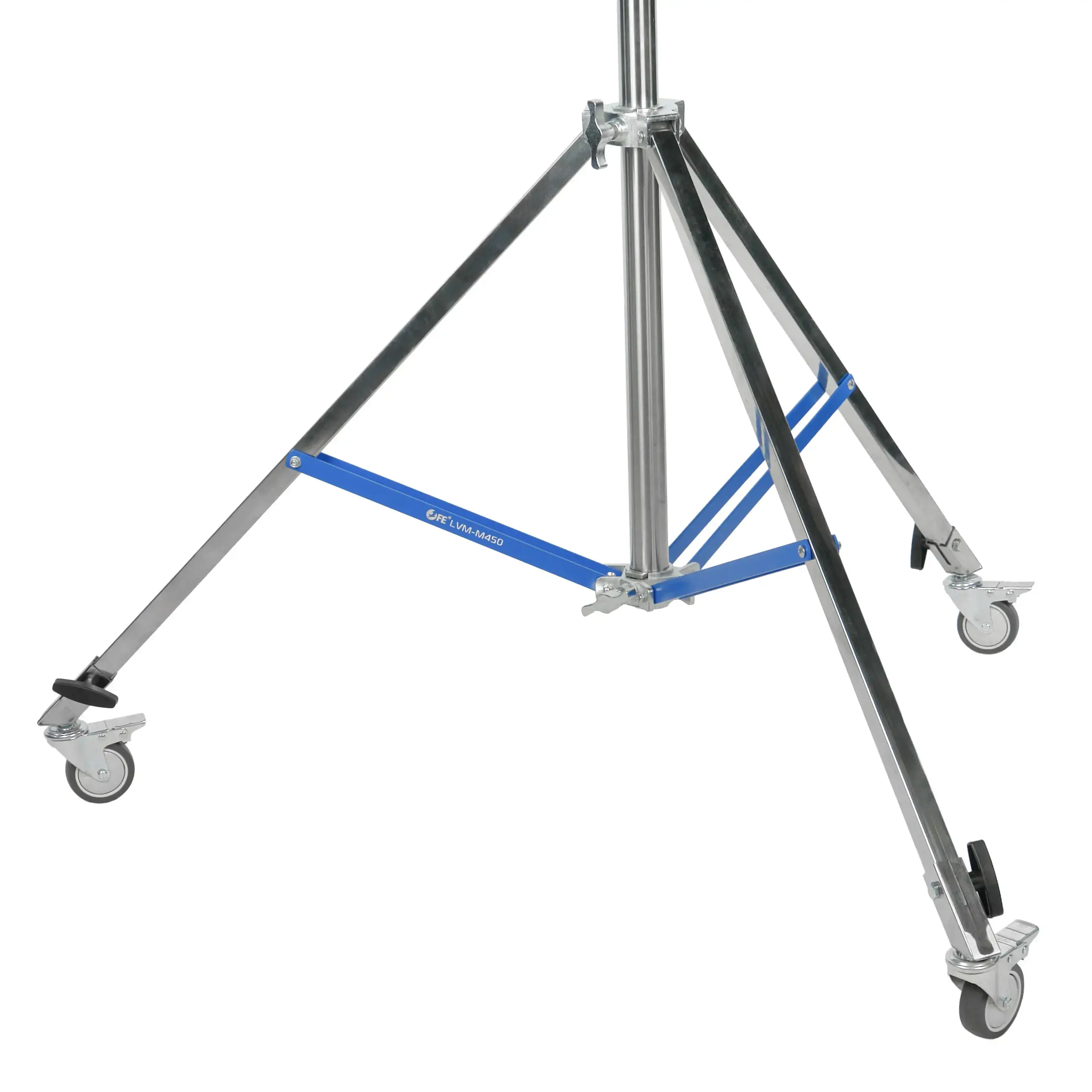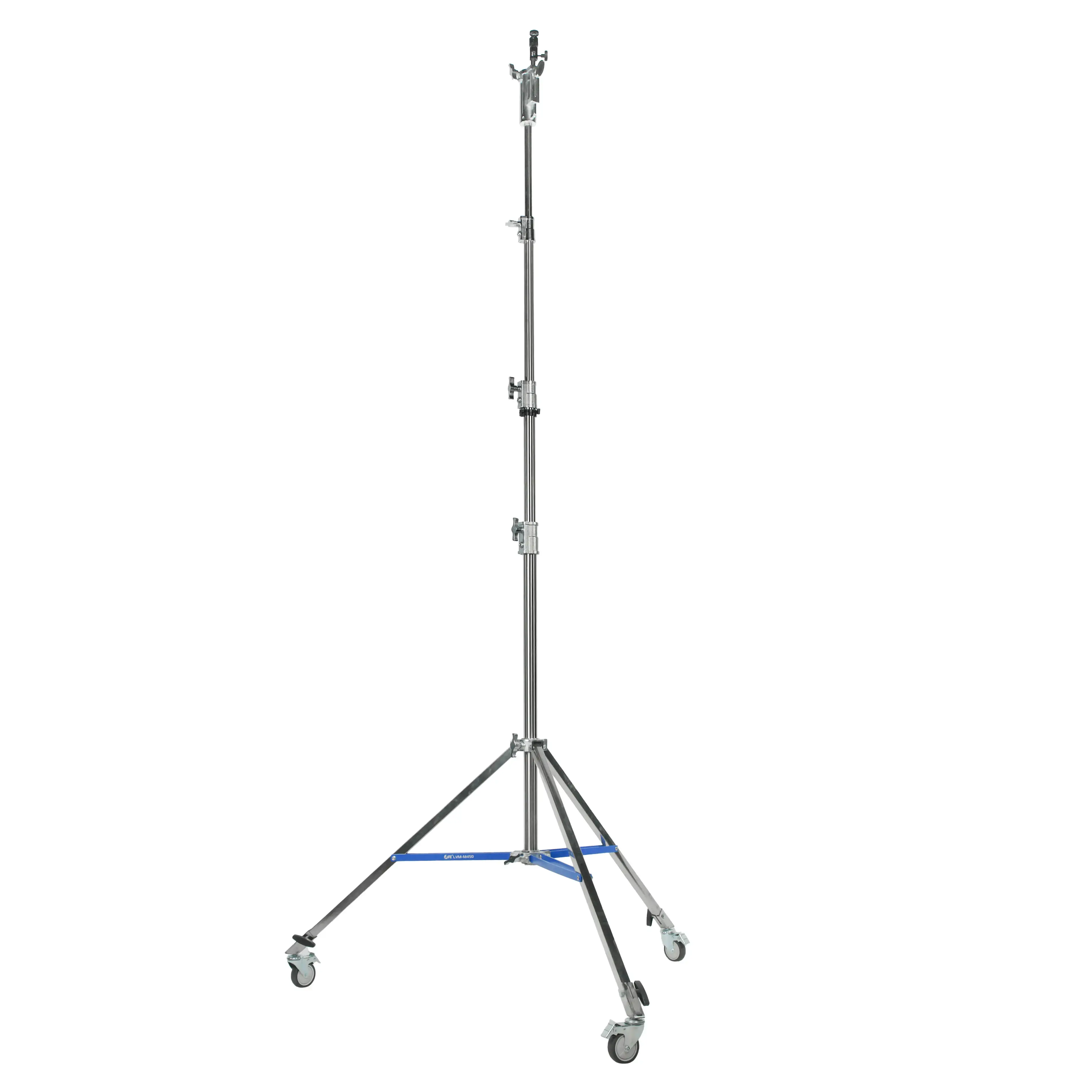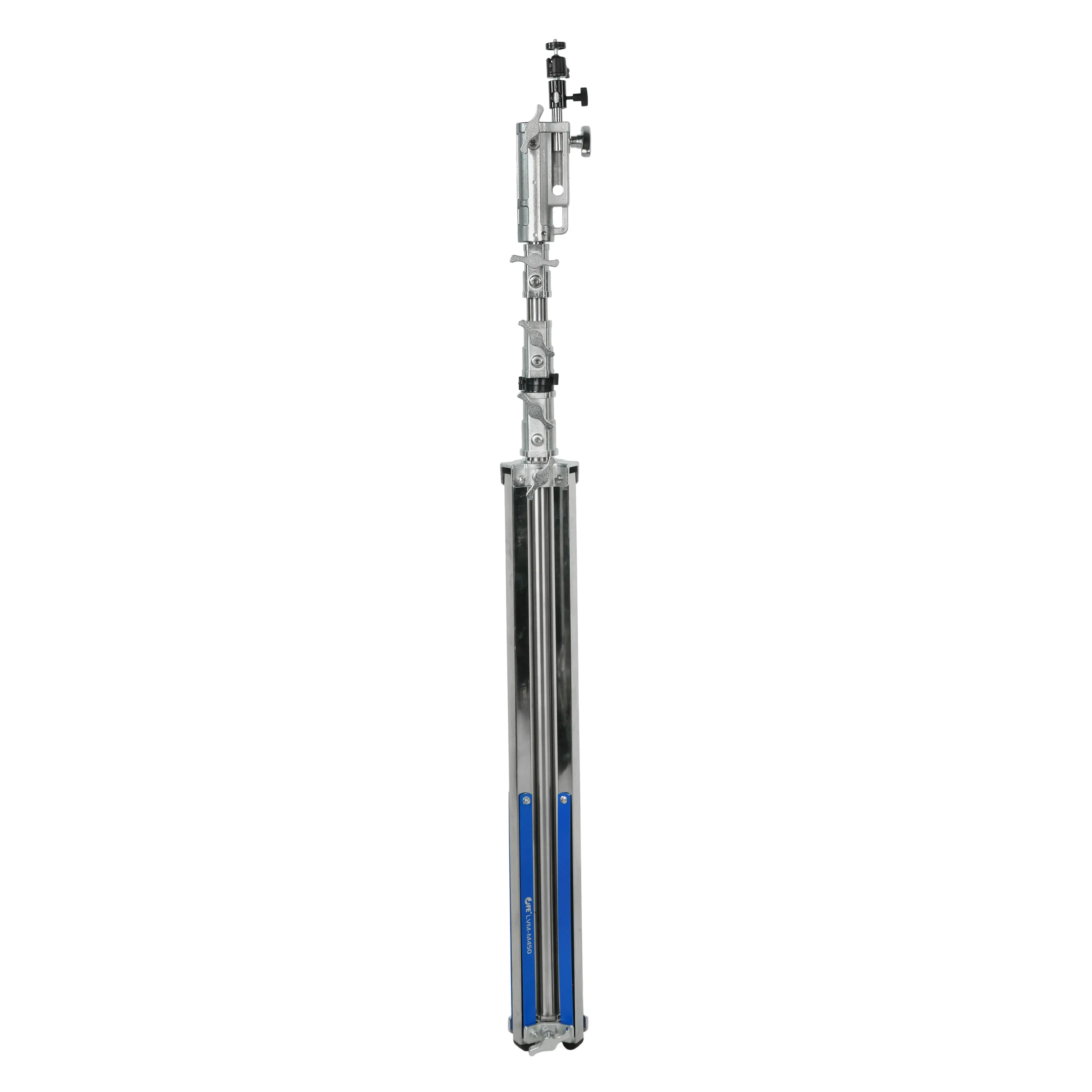 Стойка изготовлена из цельной стали, что гарантирует жесткость и устойчивость при полной нагрузке. Телескопическая четырехсекционная колонна на треноге достигает максимальной высоты 450 см. Большой диаметр секций (40/35/30/25 мм) обеспечивает оптимальную жесткость и распределение нагрузки, минимизируя раскачивание. Каждая секция надежно фиксируется усиленными винтовыми зажимами.