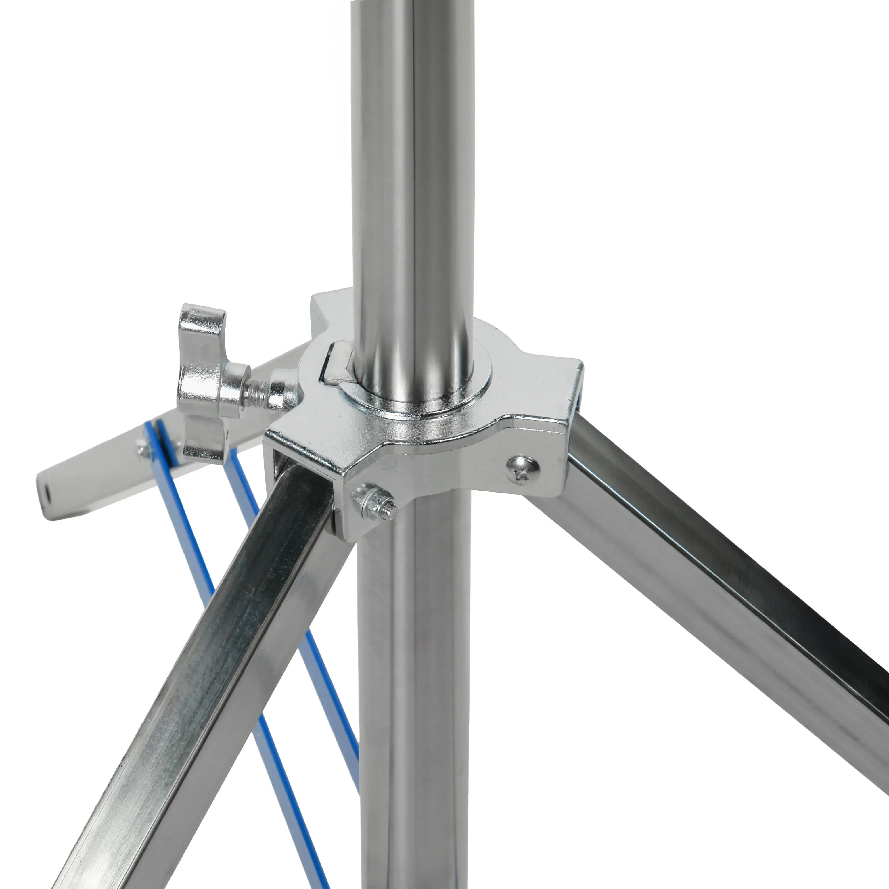 Для точной настройки и повышения жесткости стойки предусмотрен отдельный регулировочный винт в зоне растяжки треноги, изменяющий положение нижней секции центральной колонны. Функция служит для финальной калибровки высоты и дополнительного усиления конструкции перед началом съемки.