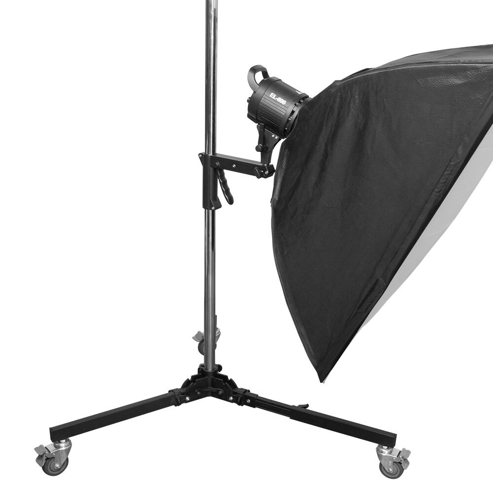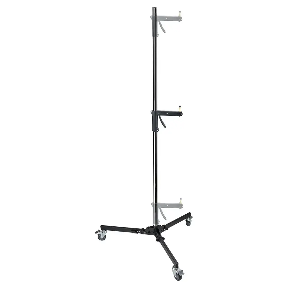 На хромированной стальной трубе размещается скользящий кронштейн с гнездом Baby (комплектуется съемным штифтом Baby) и подпружиненной рукояткой. Высота размещения скользящего кронштейна быстро регулируется одной рукой от уровня пола до верхней части колонны. Складывающаяся база с колесами легко снимается для удобного хранения и транспортировки. Одна ножка оборудована выравнивающим устройством для устойчивости на неровных поверхностях, а выдвижная ножка (+12 см) повышает грузоподъемность при использовании с перекладиной в режиме журавля.