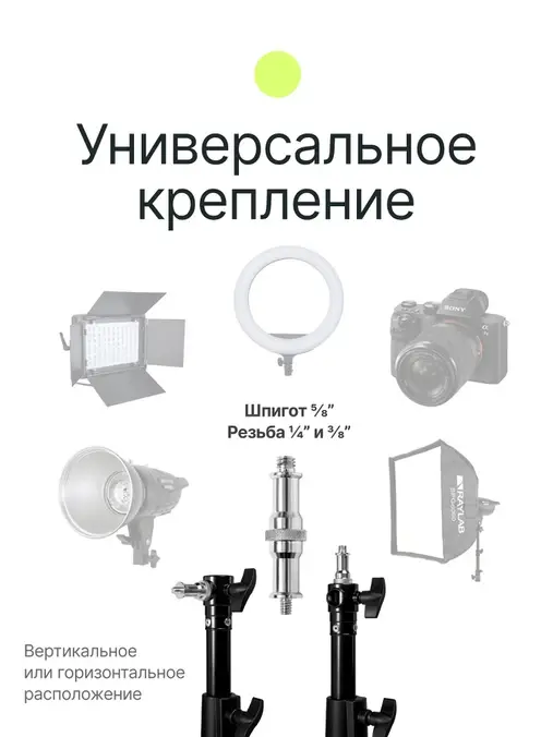Компания Raylab предлагает разнообразные стойки для установки накамерных и студийных вспышек, светодиодных панелей, зонтов и другого студийного оборудования для различных видов съемки. Независимо от вида съемки: предметная съемка, портретная съемка, стрим или фэшн съемка, студийная съемка или фуд съемка - стойка для фотозоны Raylab станет идельным помощником для вашего творчества! Стойка для оборудования - надежная опора для ваших накамерных вспышек и световых панелей. Стойка освещения Raylab имеет устойчивую конструкцию, которая обеспечивает стабильность и безопасность в процессе работы. Данное оборудование для фото специально разработано для осветительных устройств и позволяет легко регулировать высоту и направление света. Данное оборудование для видео - идеальный выбор для студийной съемки и создания профессиональных видео. Воздушная амортизация стойки - это техническое решение, которое обеспечивает мягкое и плавное движение стойки, и гарантирует надежную фиксацию на нужной высоте. Благодаря воздушной амортизации, фотографы и видеографы могут создавать устойчивую и надежную платформу для своего оборудования, чтобы получить идеальные кадры без дрожания и вибраций. Стойка для софтбокса Raylab - незаменимый инструмент для портретной и предметной съемки, обеспечивающий мягкое и равномерное освещение. Компактные и легкие стойки Raylab для световых панелей - идеальный штатив для света для мобильных фотографов и видеоблогеров. Данное оборудование для стрима легко переносится и устанавливается в нужное место. Создавайте профессиональные фотозоны для различных съемок, включая фэшн, фуд фото, и предметную съемку. Независимо от вашего стиля съемки, стойка штатив Raylab даст вам возможность проявить свой творческий потенциал и получить высококачественные результаты. От начинающих фотографов до профессиональных видеографов - данные стойки и штативы будут незаменимым аксессуаром в вашем творческом арсенале. Приступайте к созданию потрясающего контента, а стойка осветителя для видео Raylab Вам поможет!