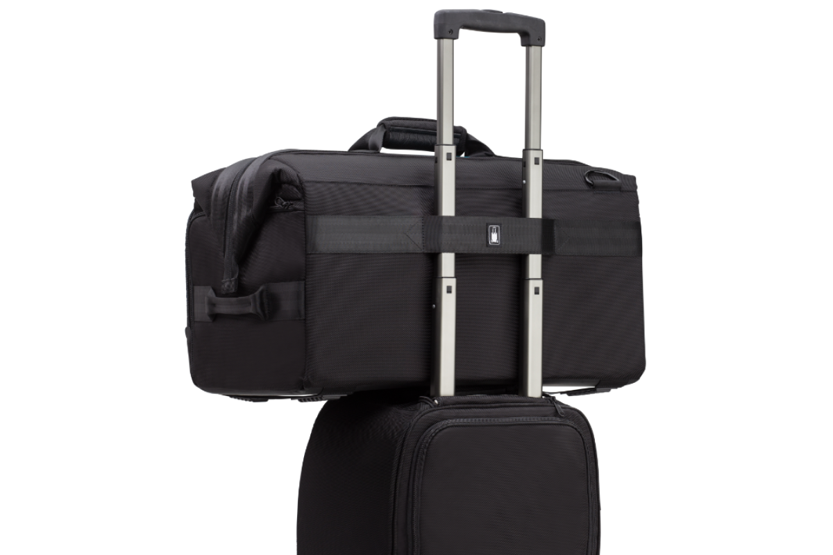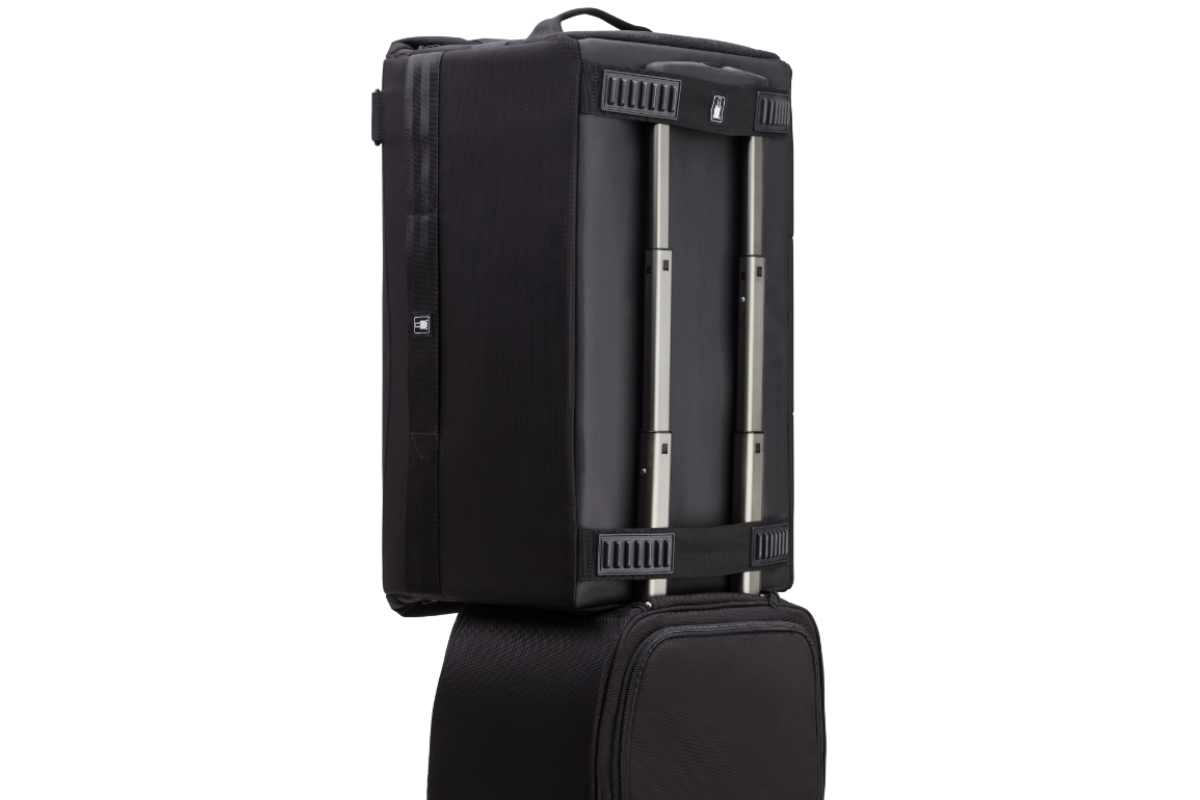 Предусмотрена установка на тележку или чемодан на колесах в горизонтальном и вертикальном положении. Для долговечности и защиты от влаги используется прочный баллистический нейлон 1680D с водоотталкивающей пропиткой DWR (Durable Water Repellent). Ткань, обработанная пропиткой DWR не впитывает воду, капли скатываются с поверхности ткани, что позволяет выдерживать экстремальные условия эксплуатации (дождь, снег, град, перепад температур и т.п.).
