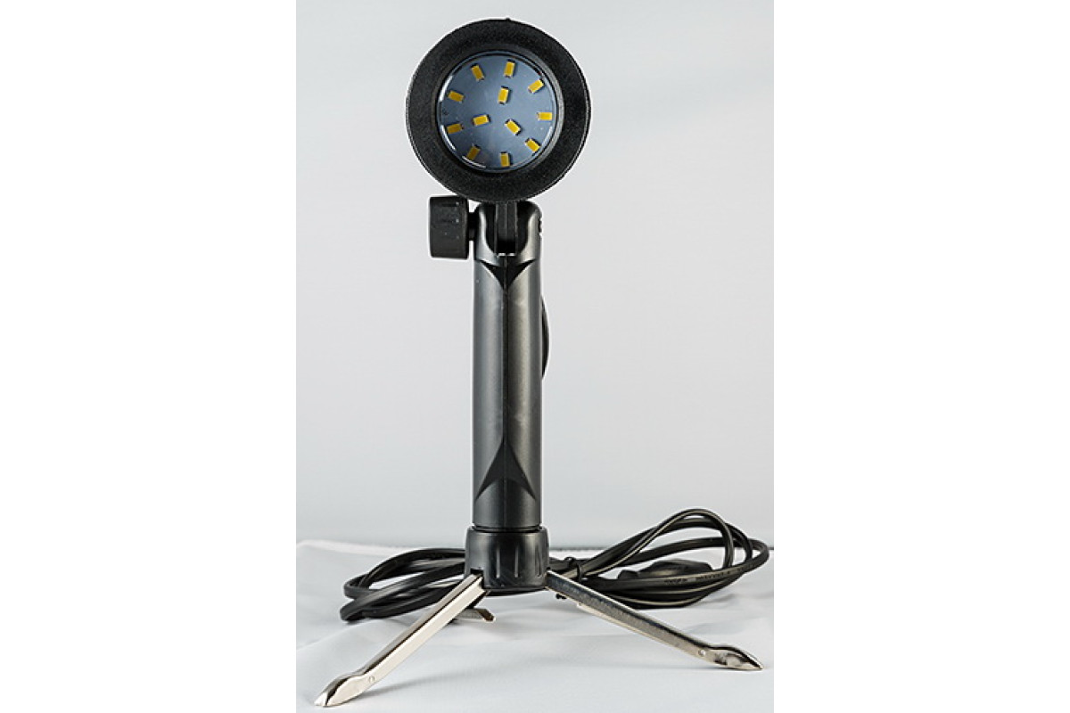 Компактный настольный светодиодный осветитель FST F-LED 7 создает достаточно узкий световой луч, в основном применяется для съемки миниатюр и небольших предметов. Встроенные ножки и наклонный кронштейн позволяют сэкономить на отдельном штативе. Свет дневной температуры, 5500 К. Мощность прибора: 7 Вт, по яркости он примерно соответствует галогенной модели FST F-002, но, в отличие от галогенного осветителя, он почти не греется, что позволяет использовать его вплотную с тканевыми рассеивателями или цветными фильтрами. Также отсутствует проблема перегорающих ламп: у светодиодов ресурс намного выше.