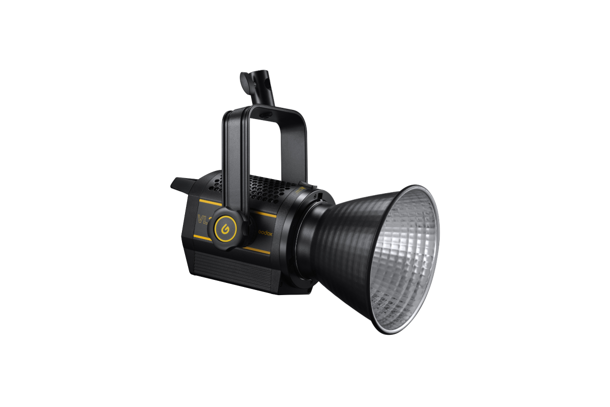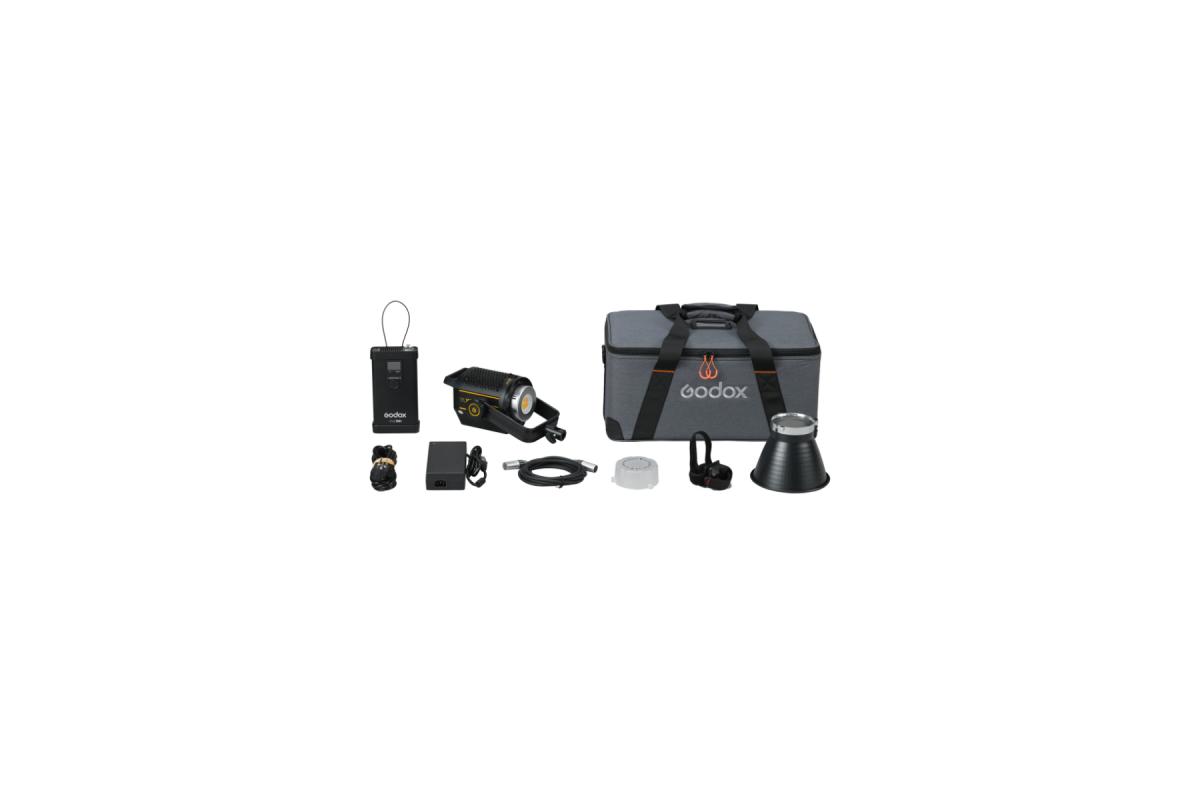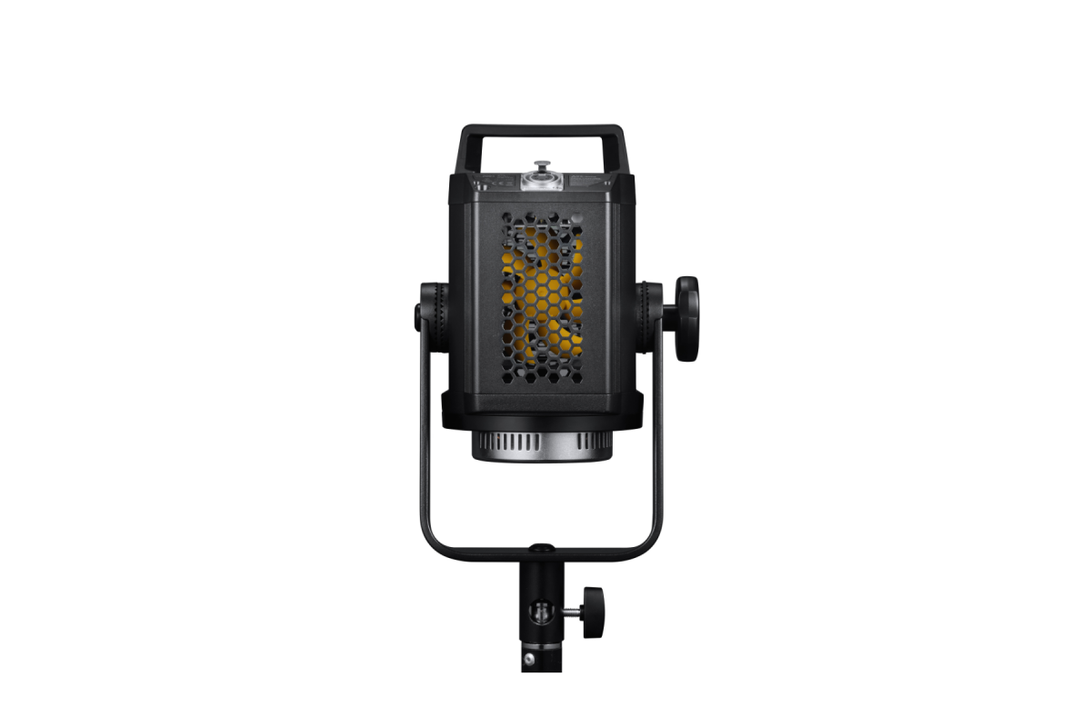 Светодиодный осветитель с круглой COB-матрицей, мощность до 165 Вт, цветовая температура 5600К, CRI/TLCI>96, регулируемая мощность светового потока 0–100%, блок управления с аккумуляторной площадкой V-mount. DMX512, беспроводное управление 2.4G, со смартфона по Bluetooth. Байонет Bowens, рефлектор с «зеркальной» поверхностью.