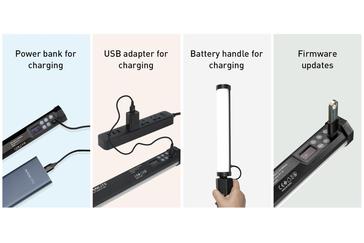 Nanlite PavoTube II 6C оснащен внутренней литий-ионной батареей, с которой может работать 65 минут при полной яркости и заряжаться от любого источника USB-C, включая powerbank.
