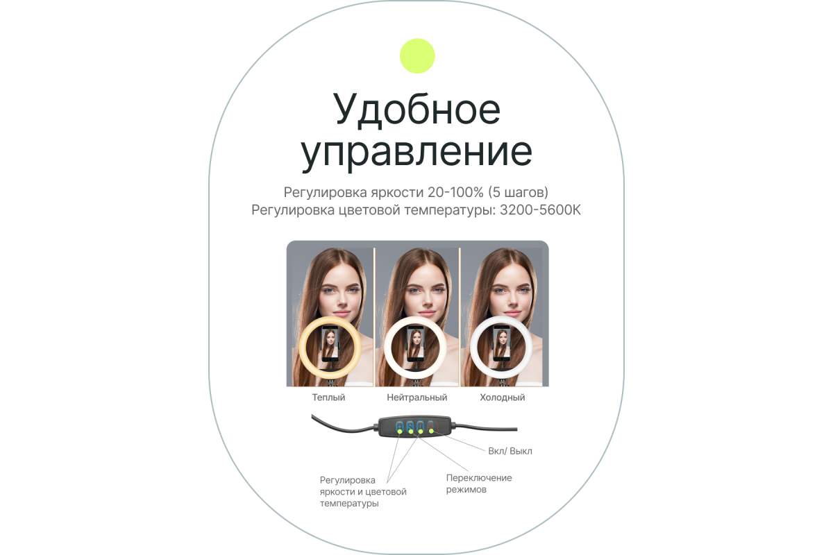 Управление мощность и цветовой температурой лампы осуществляется на панели, расположенной на кабеле подключения.