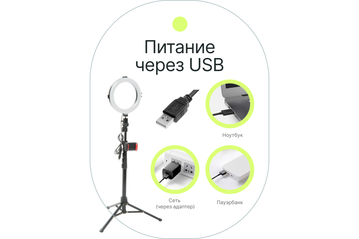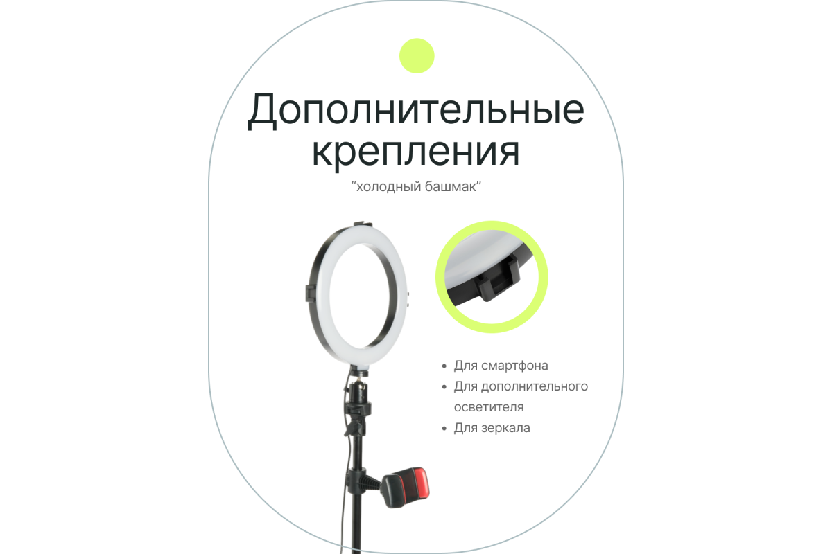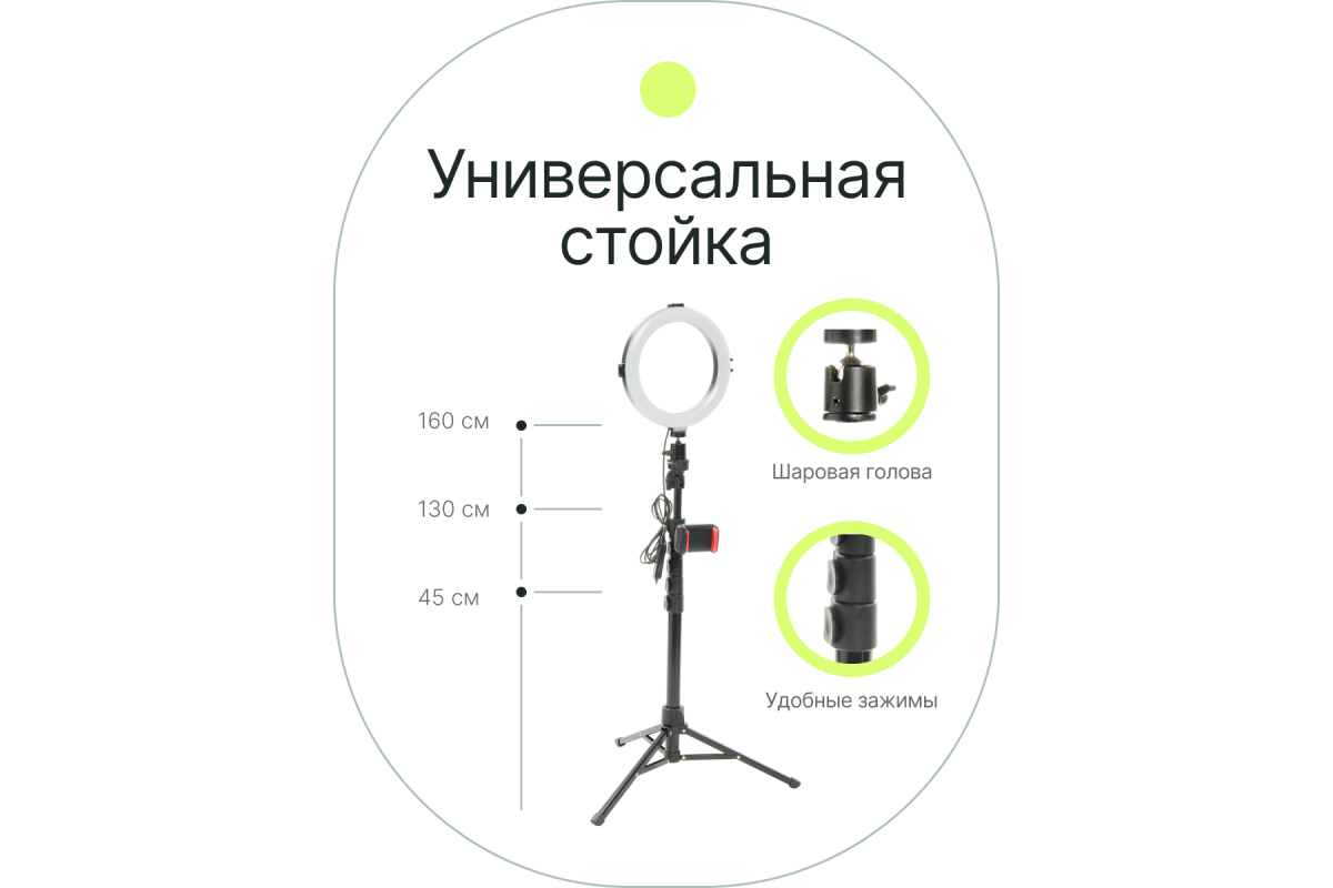 Держатель для смартфона в комплекте поворачивается на 360° и устанавливается на стойку, что даёт больше возможностей для управления процессом съёмки – установить свет ближе или дальше от лампы. Стойка c широким диапазоном регулировок обеспечивает устойчивое положение комплекта на полу или столе.