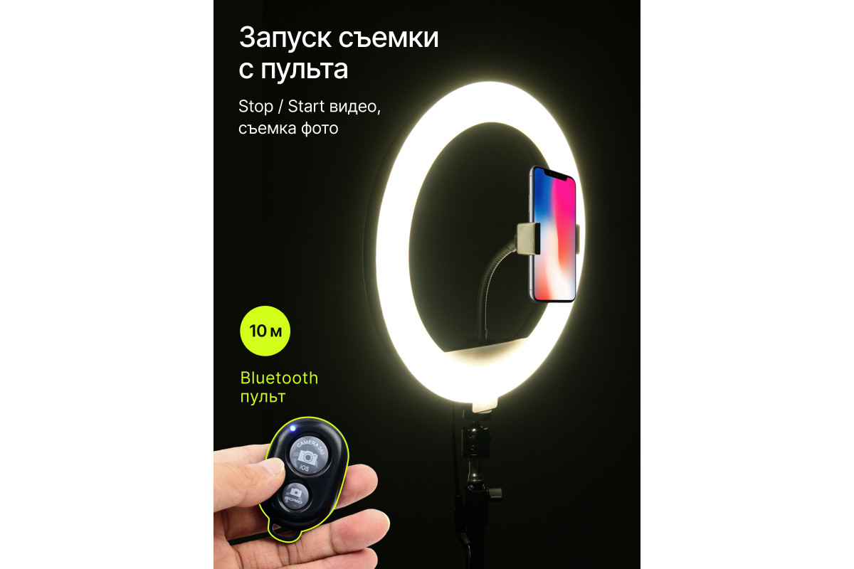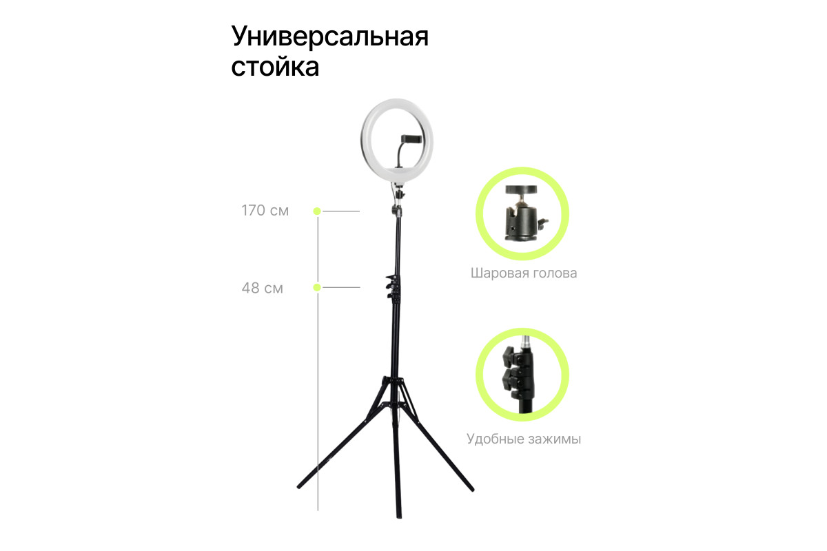 Универсальный гибкий держатель для смартфона в комплекте надежно удержит его в нужном положении на протяжении всей съемки. Стойка c широким диапазоном регулировок обеспечивает устойчивое положение комплекта и быстрое изменение положения лампы. А удобные пульты управления позволяют изменять цветовую температуру, яркость или управлять записью через Bluetooth.