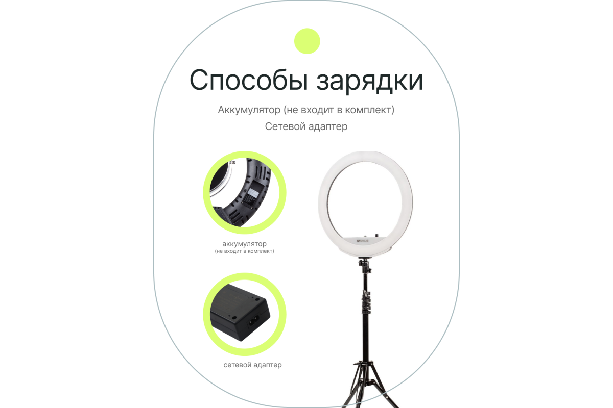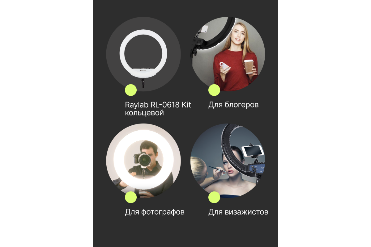 Кольцевые осветители позволяют получить прекрасное равномерное освещение, отсутствие лишних теней, ровный цвет кожи и необычный эффект ореола в глазах модели. Также, данный вид ламп незаменим при предметной съемке, так как заменяет несколько видов оборудования и имитирует естественное освещение. 448 SMD светодиодов обеспечивают мощность в 48 Вт. Лампы изготовлены по современным стандартам качества и крайне долговечны, срок жизни диода составляет до 50000 часов работы. Корпус выполнен из матового материала, исключающего лишние блики и отражения, к тому же обладающего хорошей теплоотдачей. Лампа закреплена на подвижную голову, она свободно вращается и наклоняется под любым углом. RL-0618 включает в себя не только кольцевую лампу, но и все необходимое для бьюти-блога или профессионального макияжа. Помимо стойки для студийной съёмки, вы найдете в комплекте зеркало, держатель для смартфона и гибкое крепление, благодаря чему вы сможете создать свою домашнюю видео студию. Переносить лампу будет удобно в надежном транспортировочном чехле