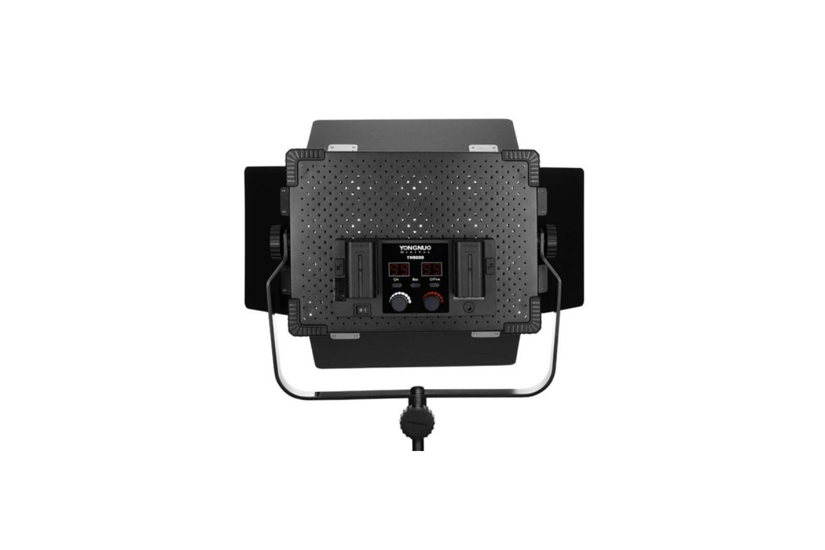 YN9000 выполнен из высокопрочного алюминиевого сплава. Оснащен дополнительно шторками для улучшения эффекта рассеивания и обеспечения большого угла освещения. Осветительное устройство может функционировать как от сетевого адаптера, так и от двух аккумуляторных батарей NP-F970. Управлять можно при помощи кнопок на задней панели и удаленно используя пульт или приложение. С мобильного устройства можно регулировать интенсивность света.