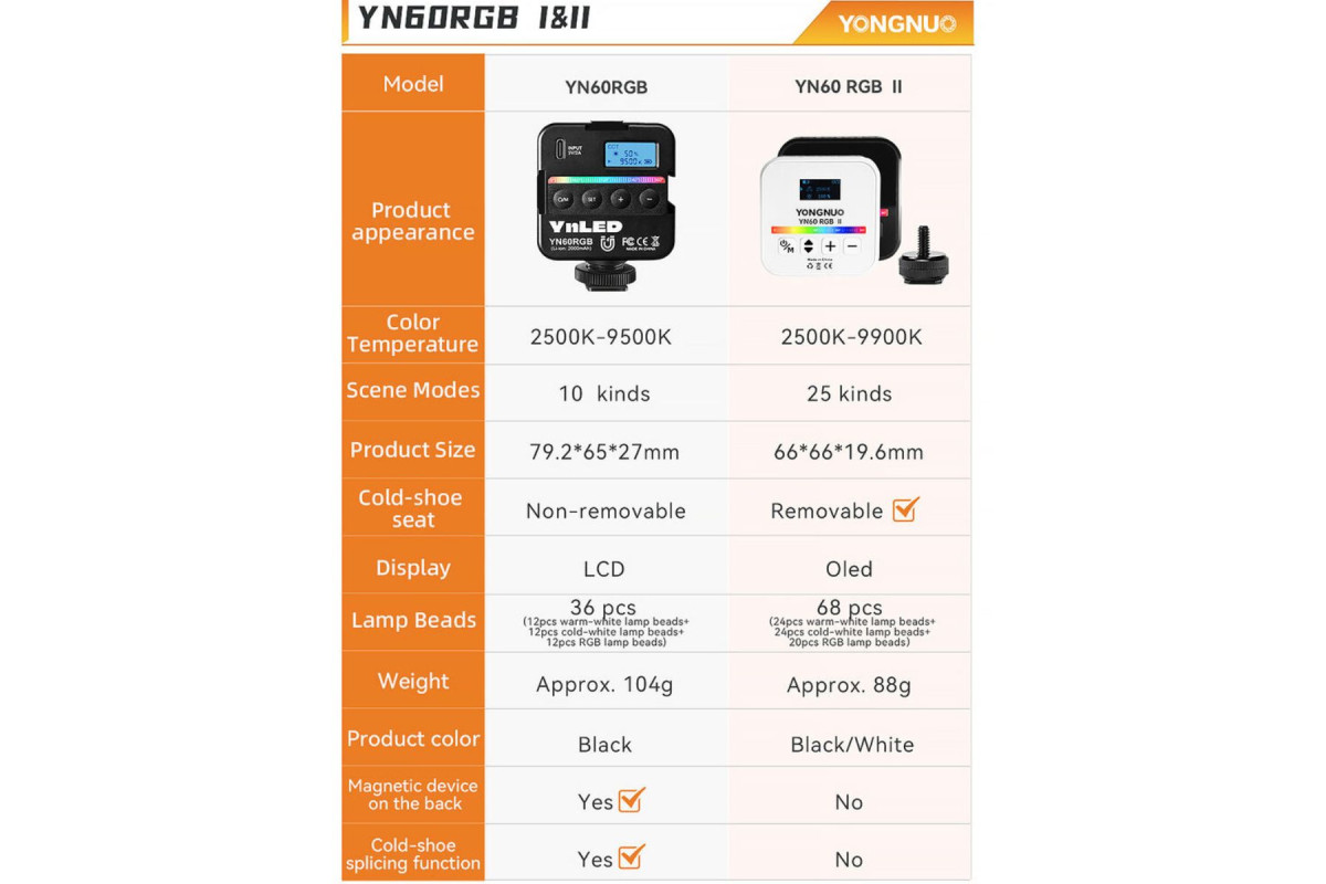 YN60RGB II предоставляет возможность регулировки цветовой температуры от холодного до теплого света, что дает большую степень свободы при выборе подходящего освещения для каждого кадра. Благодаря RGB-режиму, вы сможете экспериментировать с цветами и создавать уникальные визуальные эффекты. Это делает его идеальным выбором для создания креативного контента, затрагивая самые разные стили и подходы.