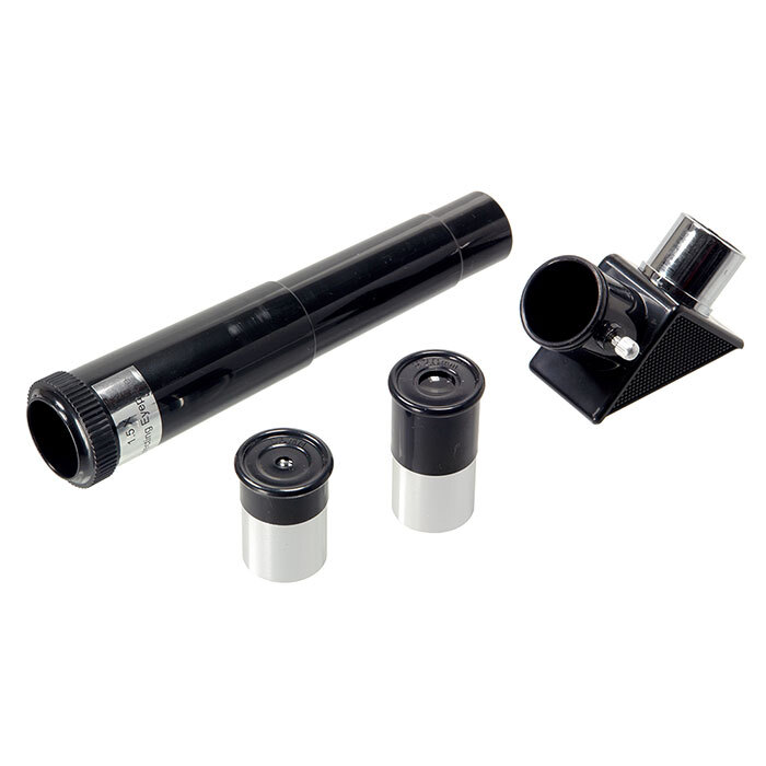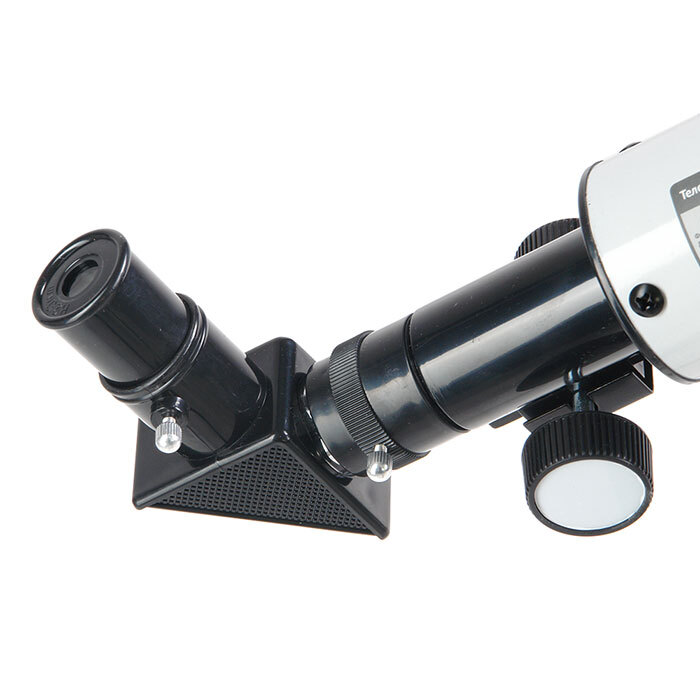Что можно в него увидеть? В него можно увидеть лунные кратеры диаметром больше 10 км, Марс, Сатурн и фазы Венеры. С помощью сменных окуляров (в комплекте 2 шт.), можно получить увеличение от 18х до 90х. Окулярная часть с 90° зеркалом позволяет удобно вести наблюдение, разместив прибор просто на столе (высота штатива 360 мм). Наблюдения днем лучше вести при увеличении 18х (с окуляром 20 мм), тогда ближняя точка фокусировки будет около 5 метров.